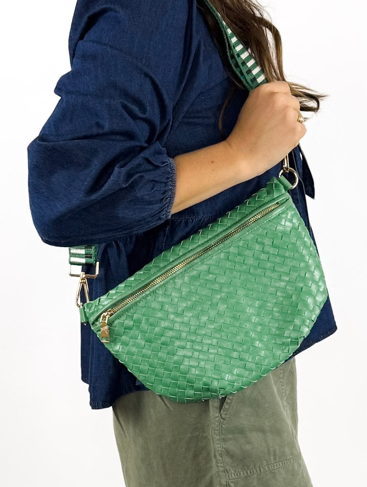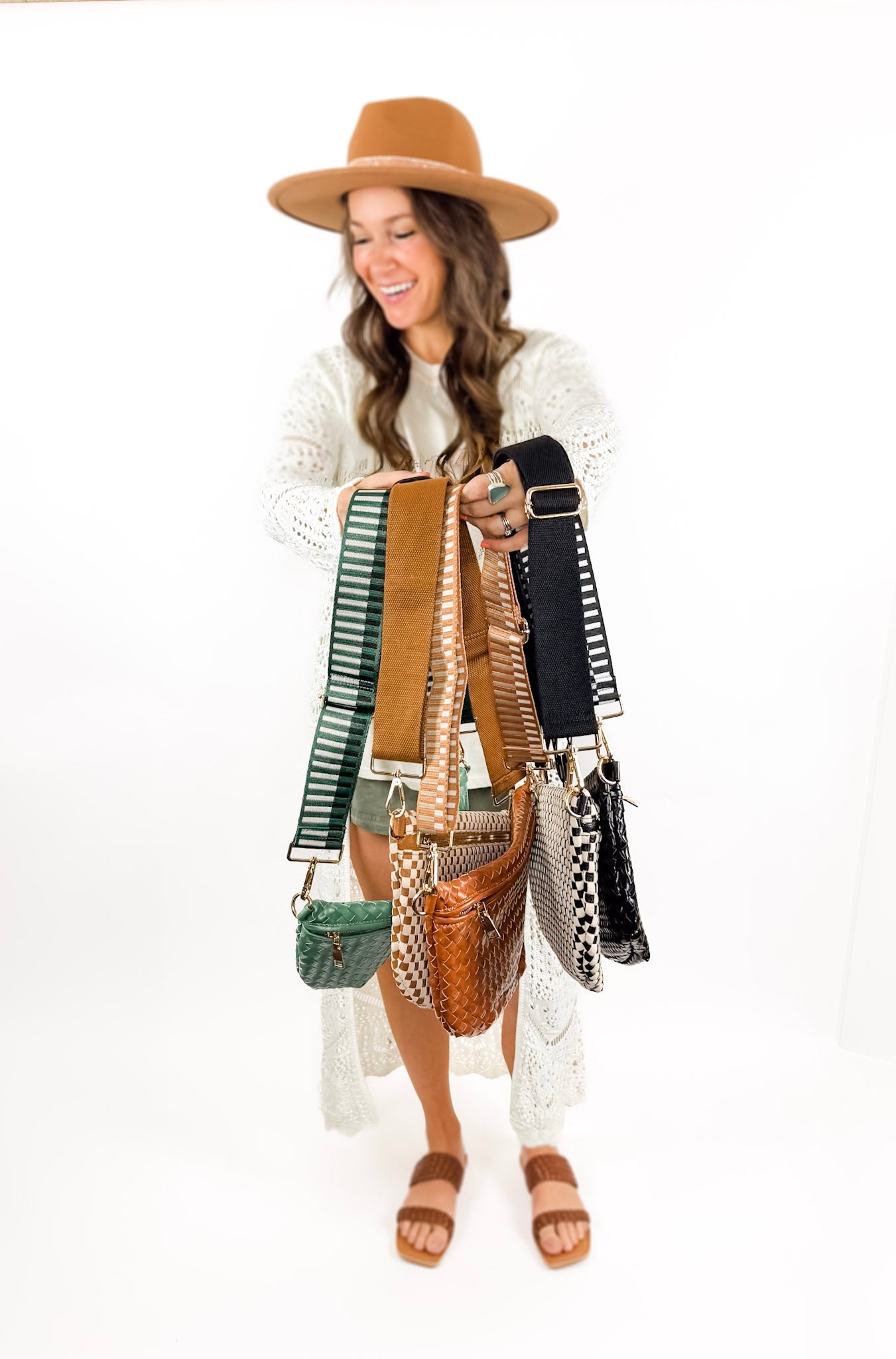 We are back with a best seller, our go-to bag! NOW IN GREEN! This woven crossbody is so chic, unique and we love that you can swap out the strap if you're feeling a change-up. Also available in cognac, blue, black, and two checkered options.