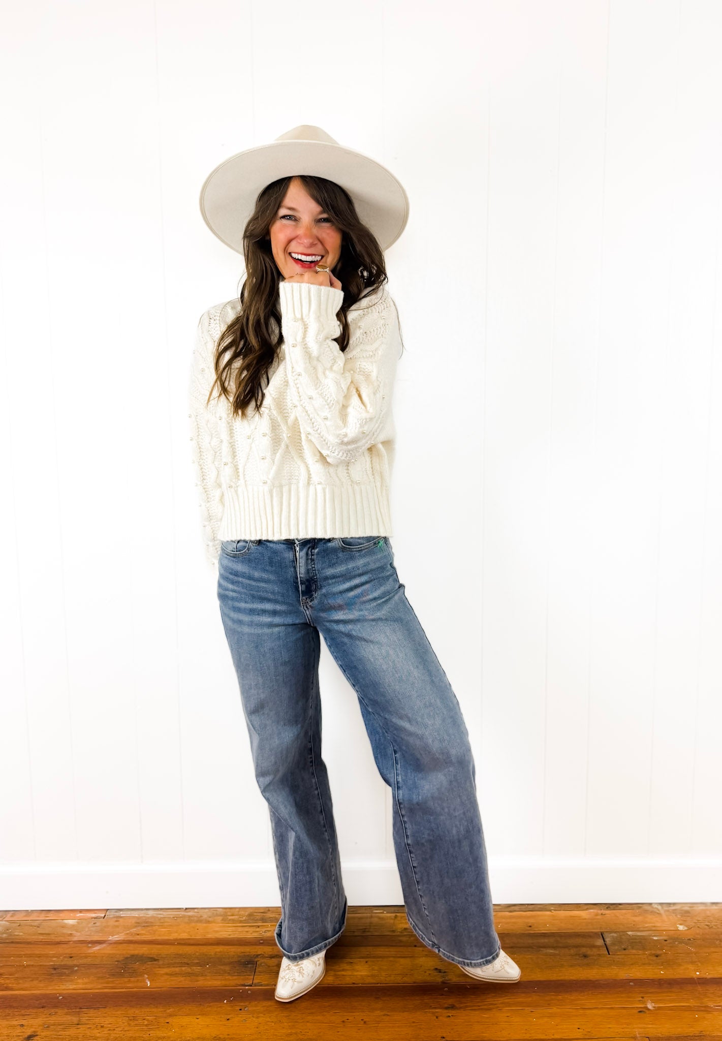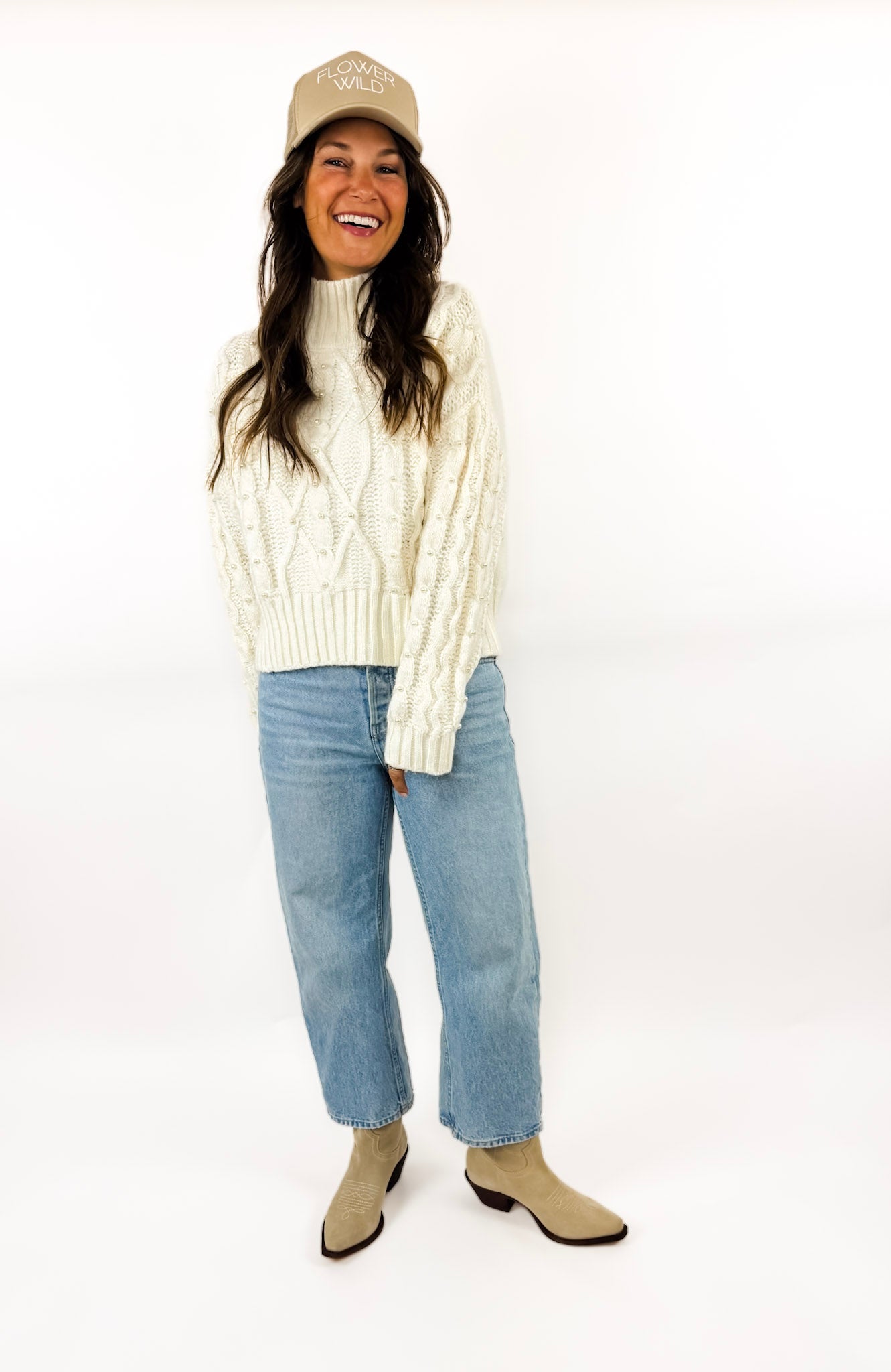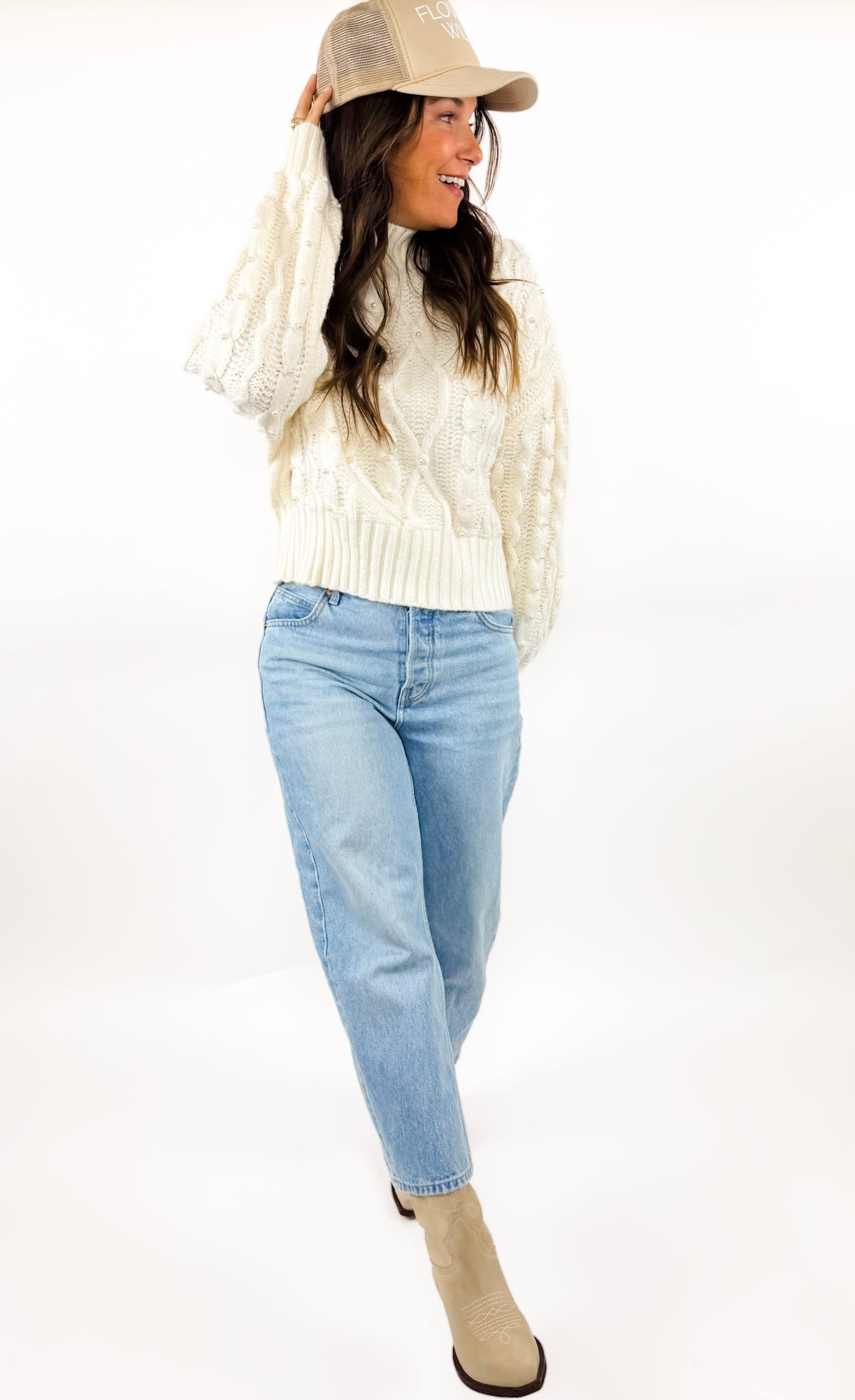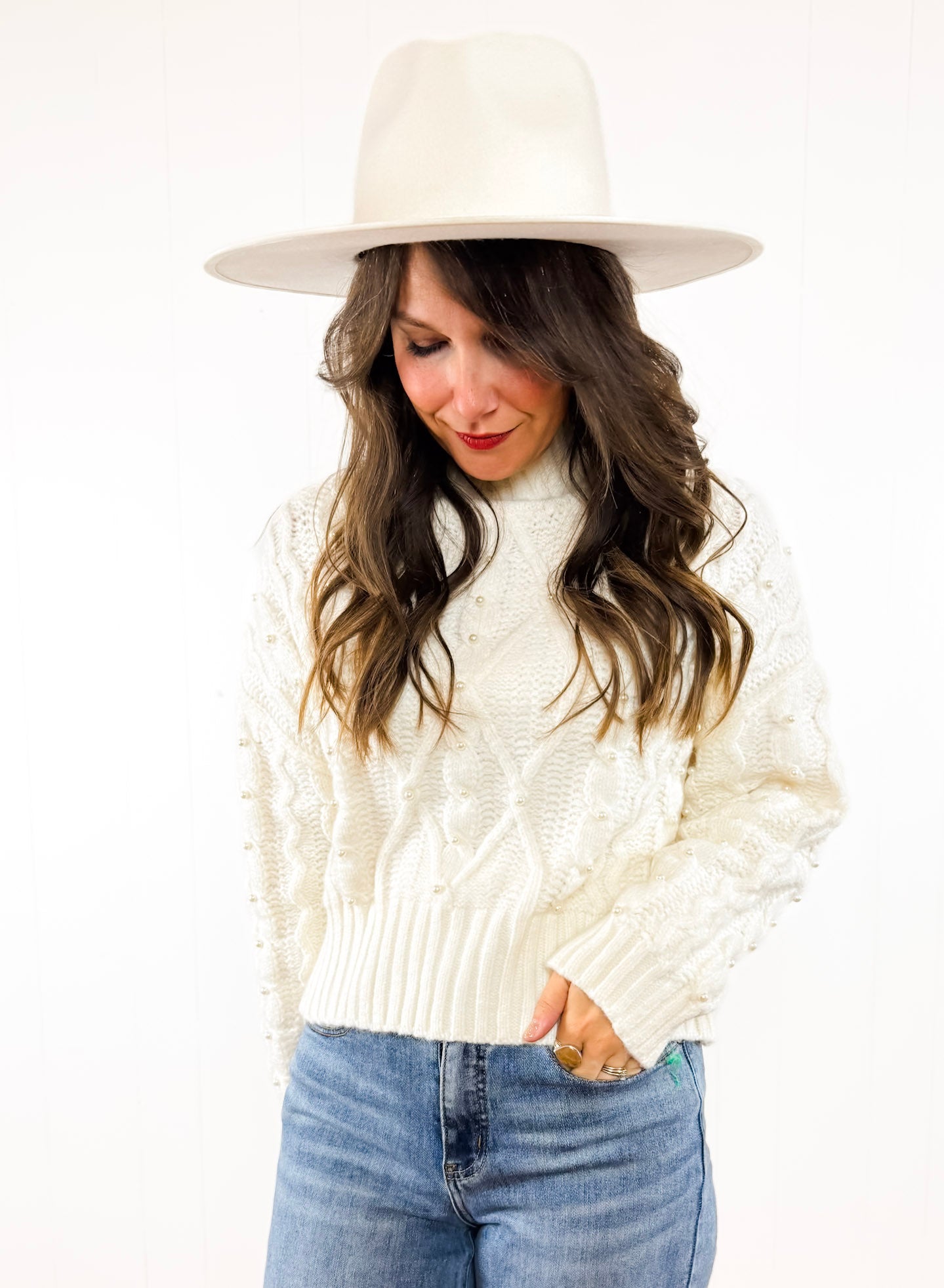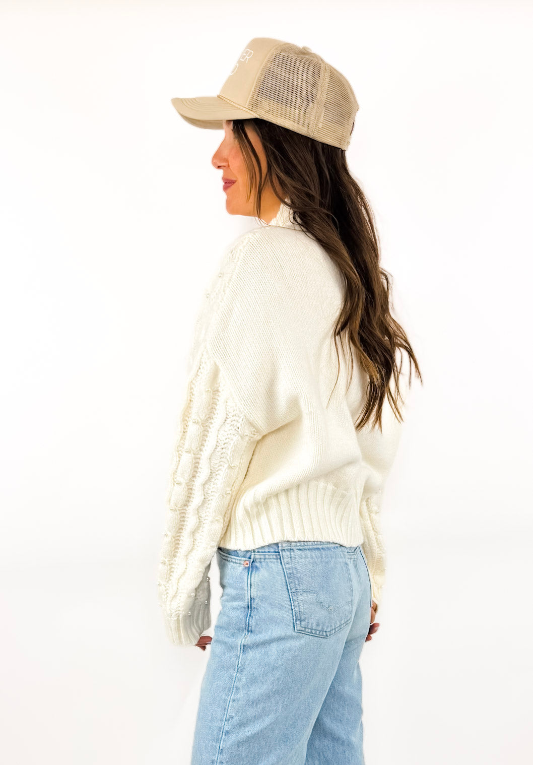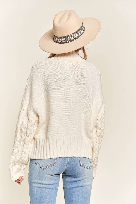 She's back! Okay, we still cannot get over how precious this sweater is! It's the perfect step up from a typical cable knit sweater and has cute little pearls sewn on the front. Soft, cozy, and effortless.