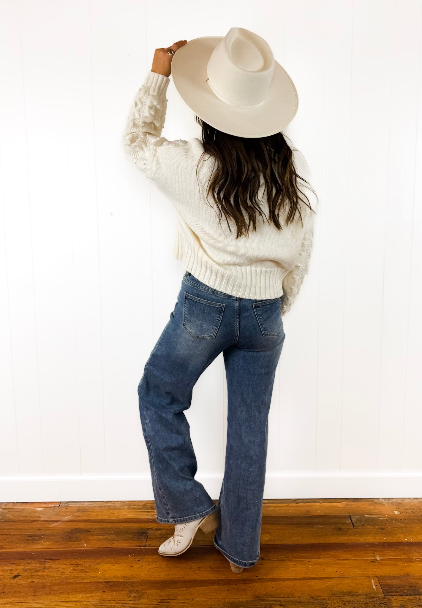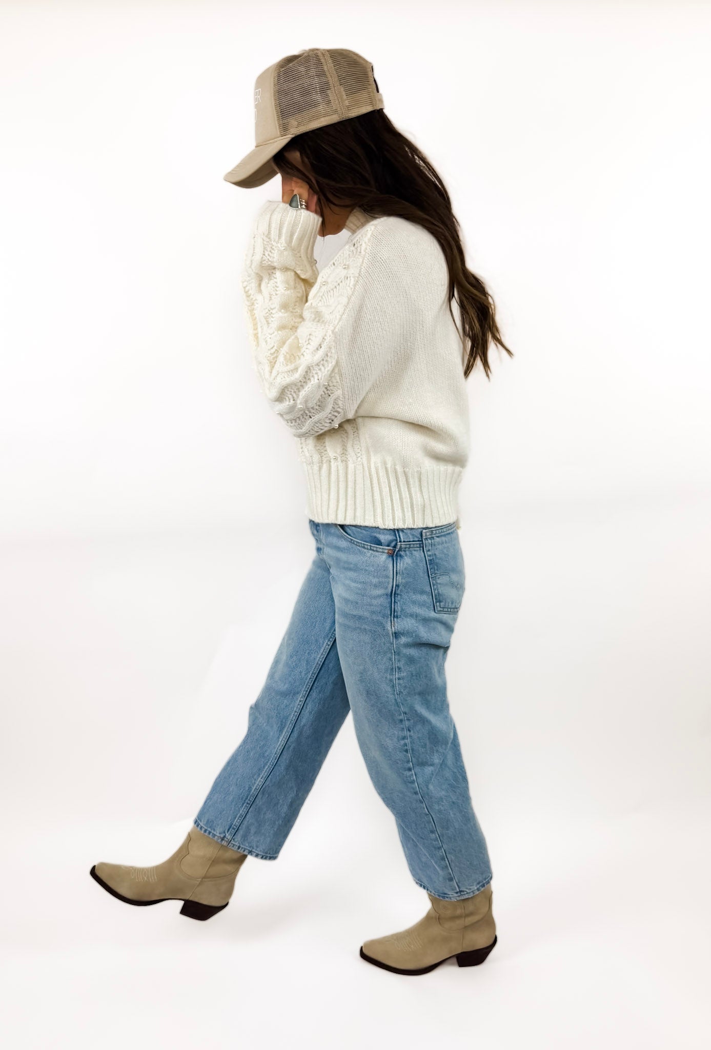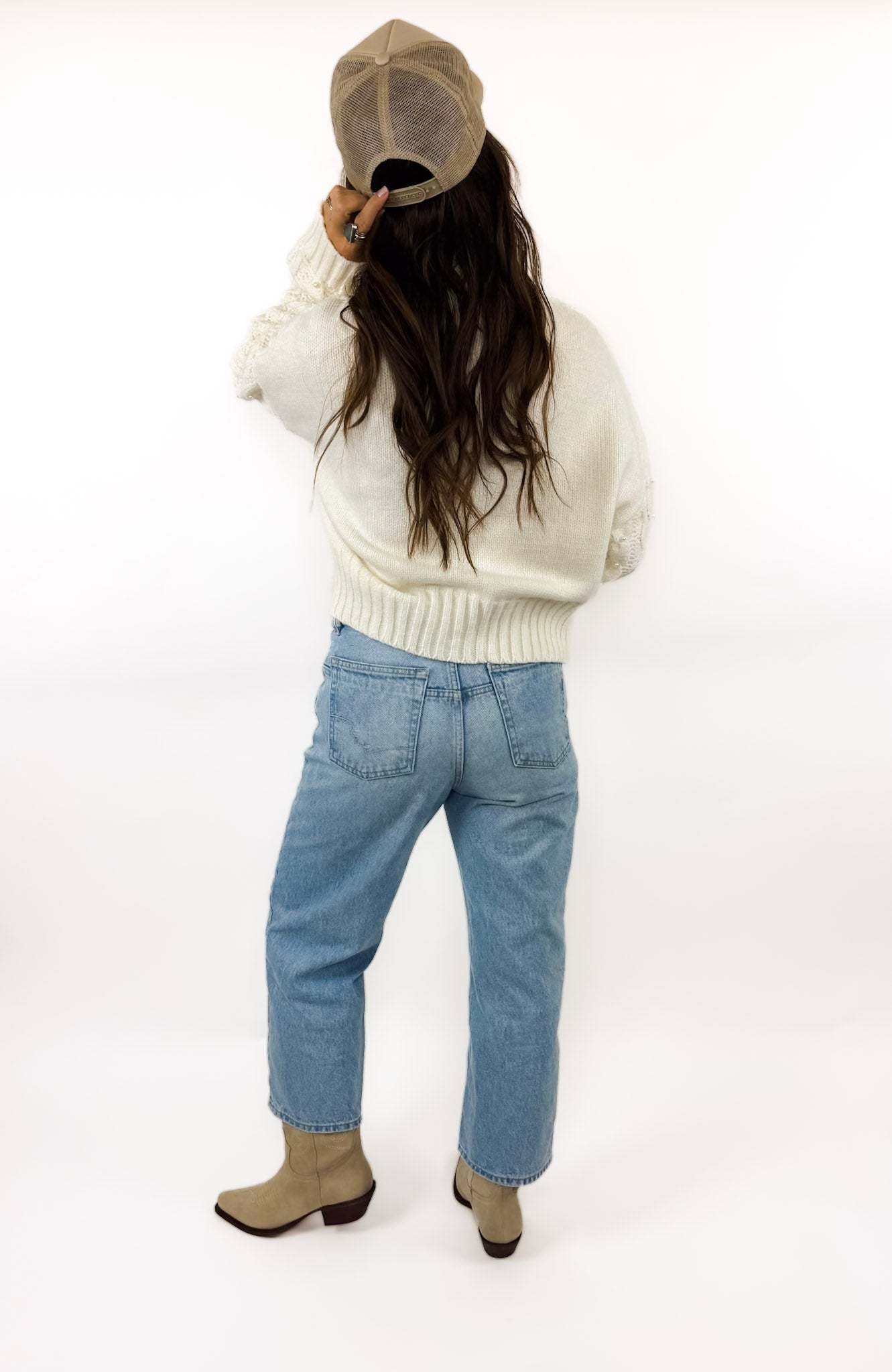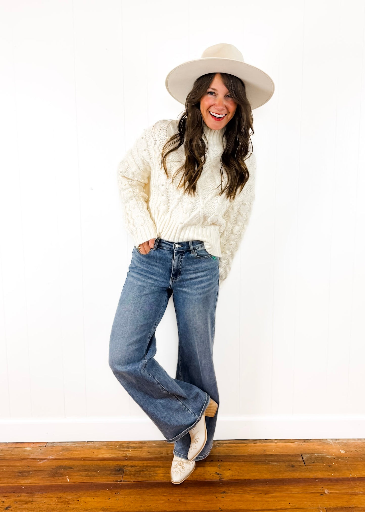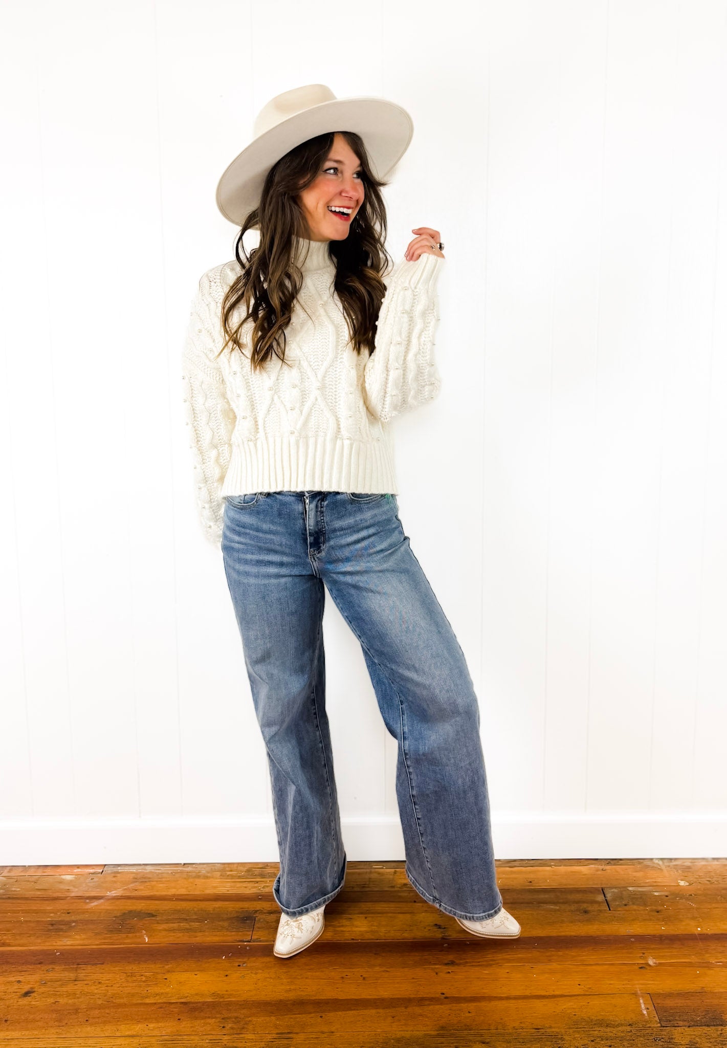 She's back! Okay, we still cannot get over how precious this sweater is! It's the perfect step up from a typical cable knit sweater and has cute little pearls sewn on the front. Soft, cozy, and effortless.