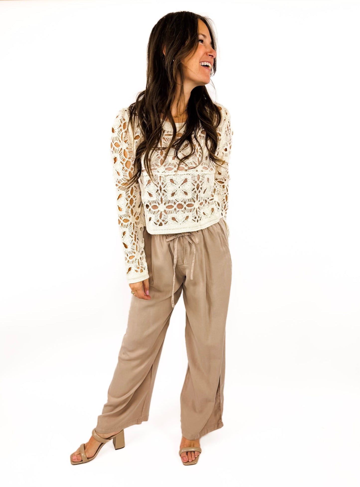 The Hattie Pant is a chic, yet playful silhouette with a paperbag waist and drawstring. The luxe fabric and the flowy leg is not only comfortable, but the ideal base of a cute outfit for every day. Dress up for the office or dress down with a graphic tee. We love them paired with the Mabel tank.
