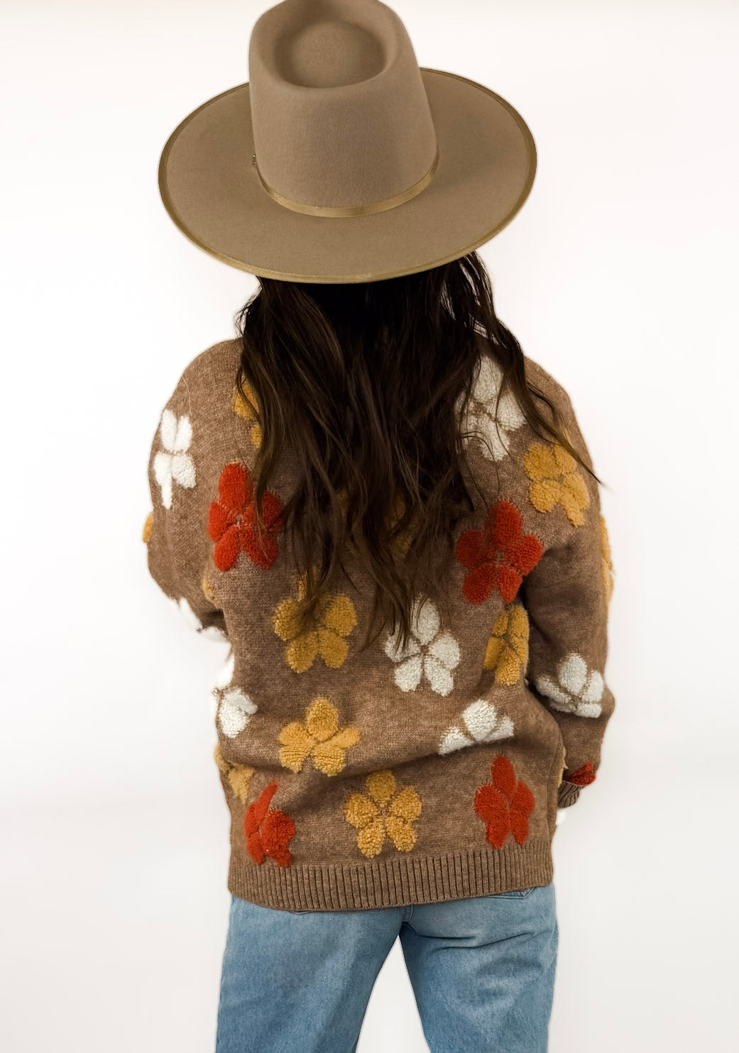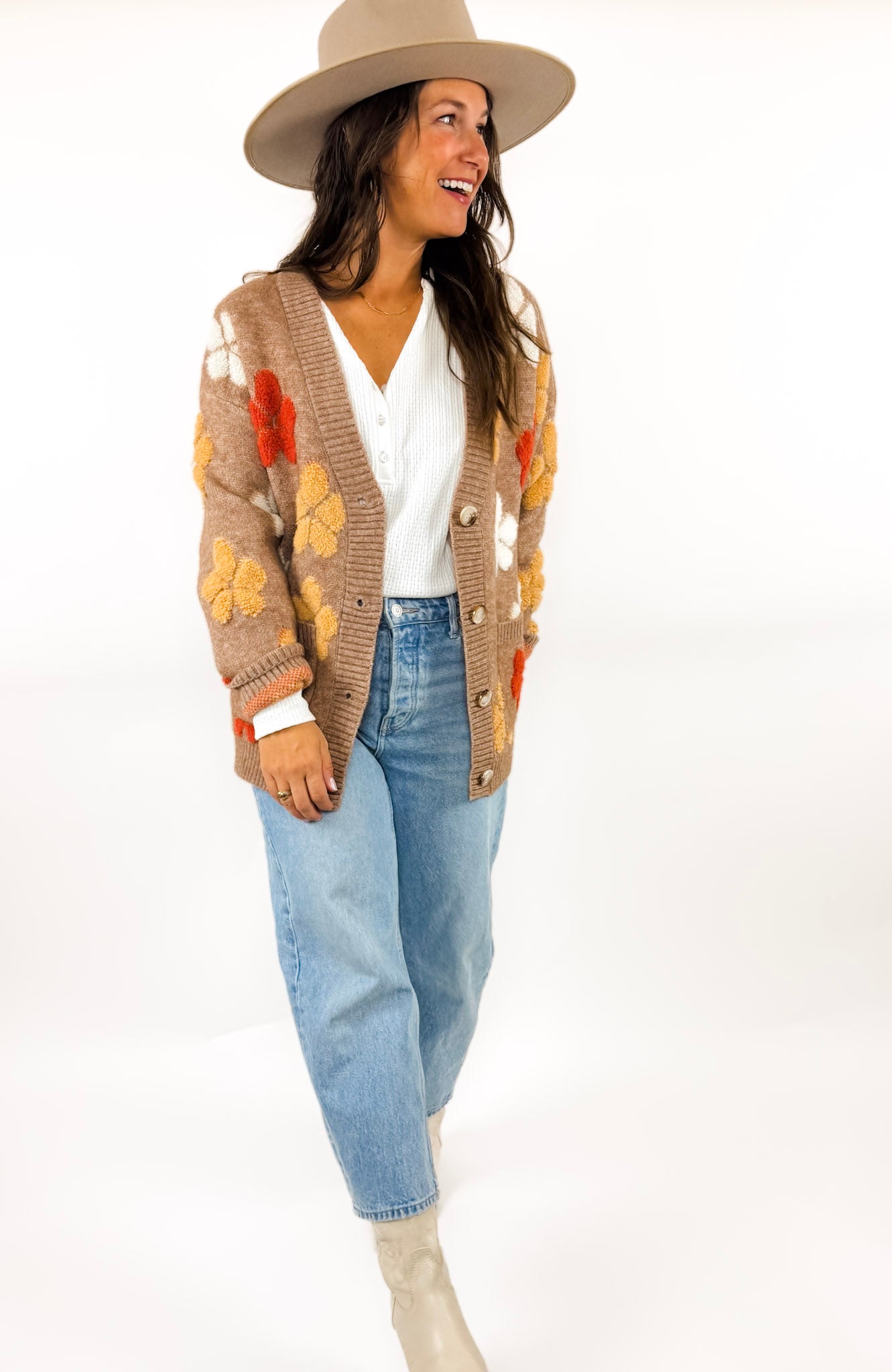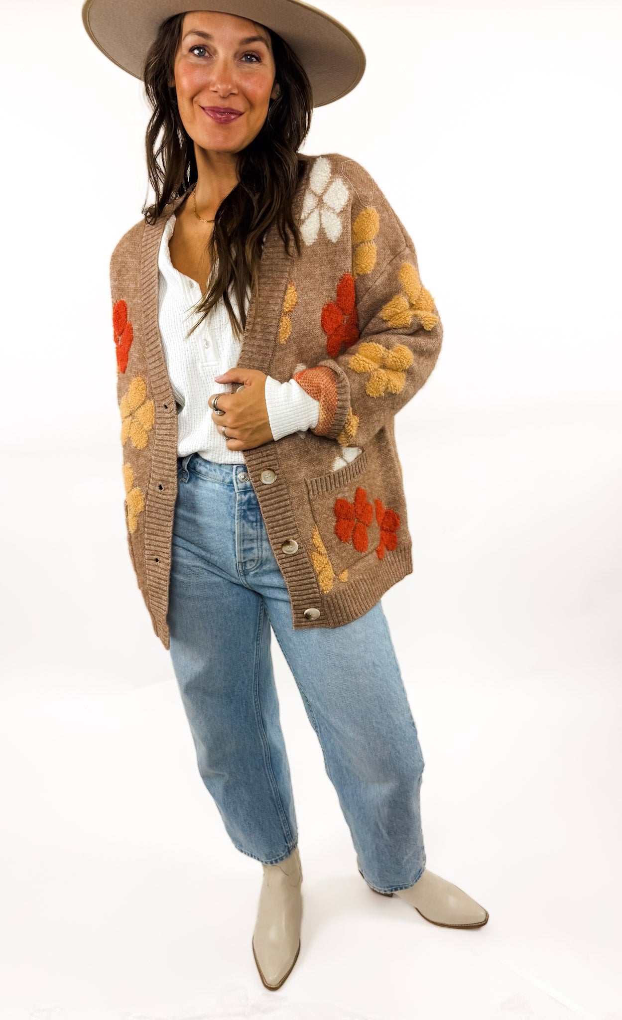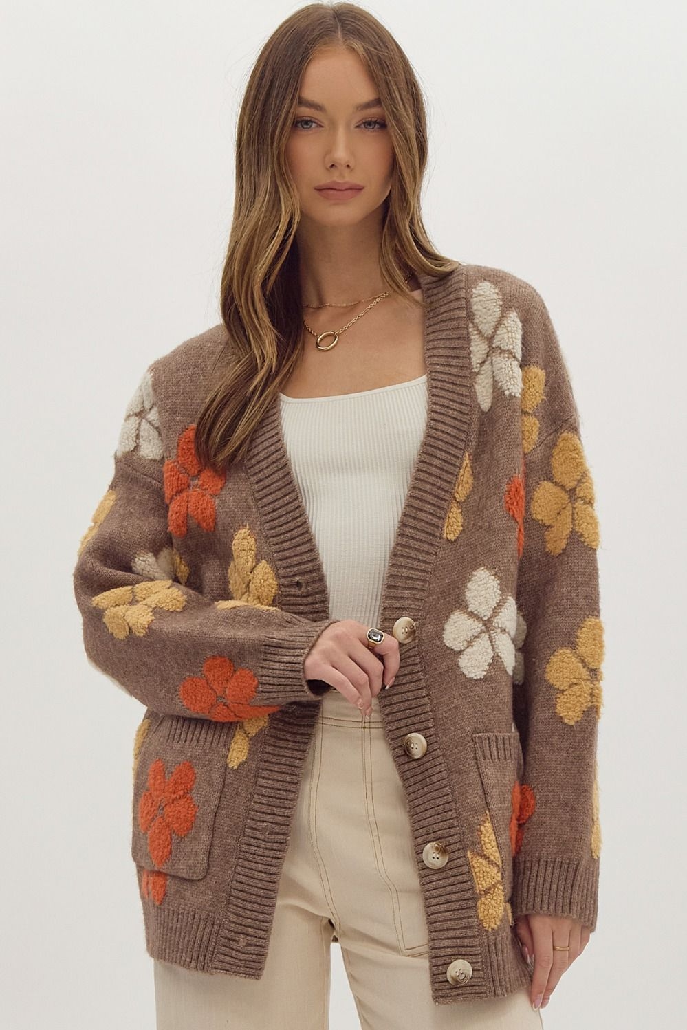 You can't go wrong with these colors for a little sunshine. The cute flowers are textured on a super soft and cozy cardigan.