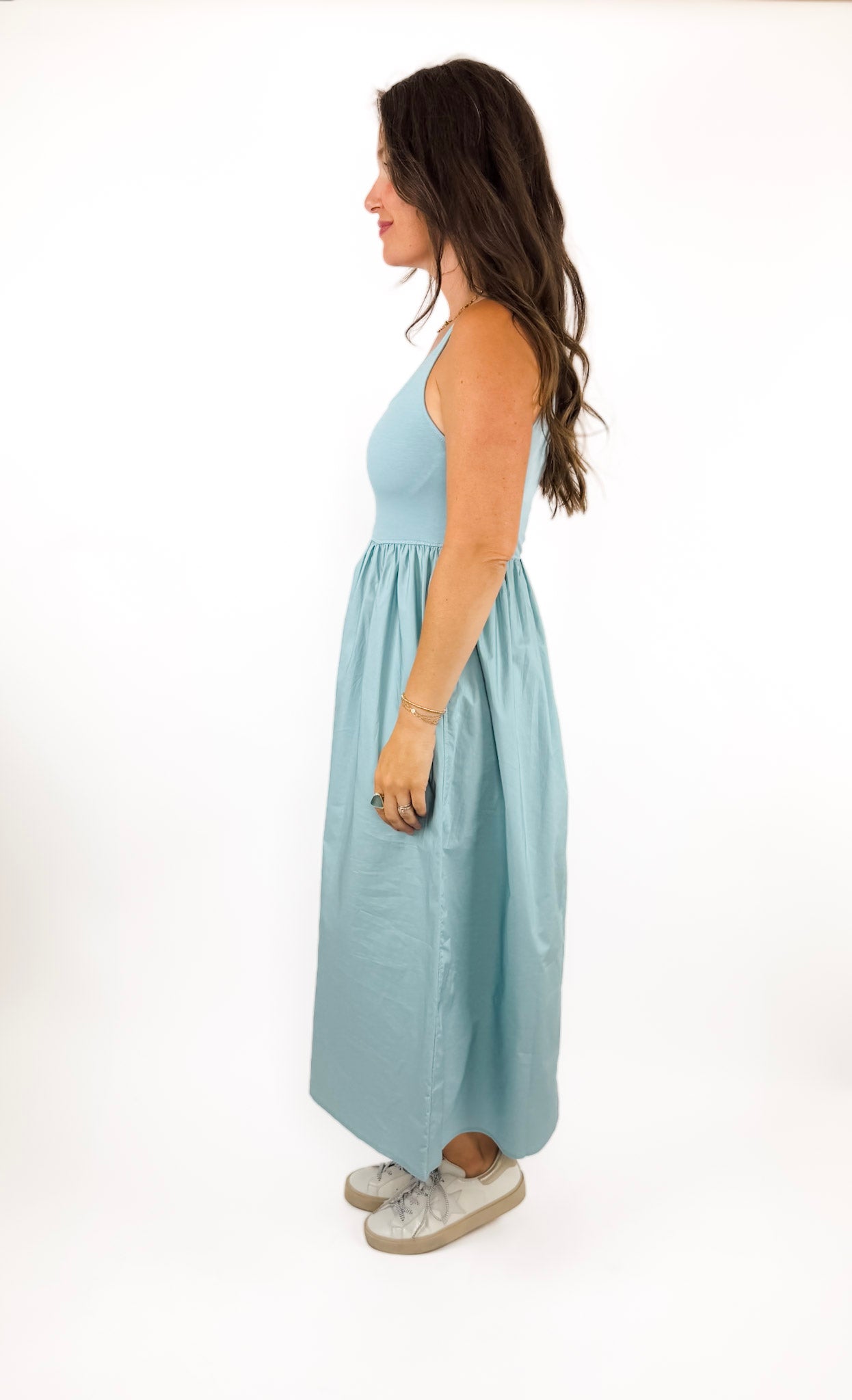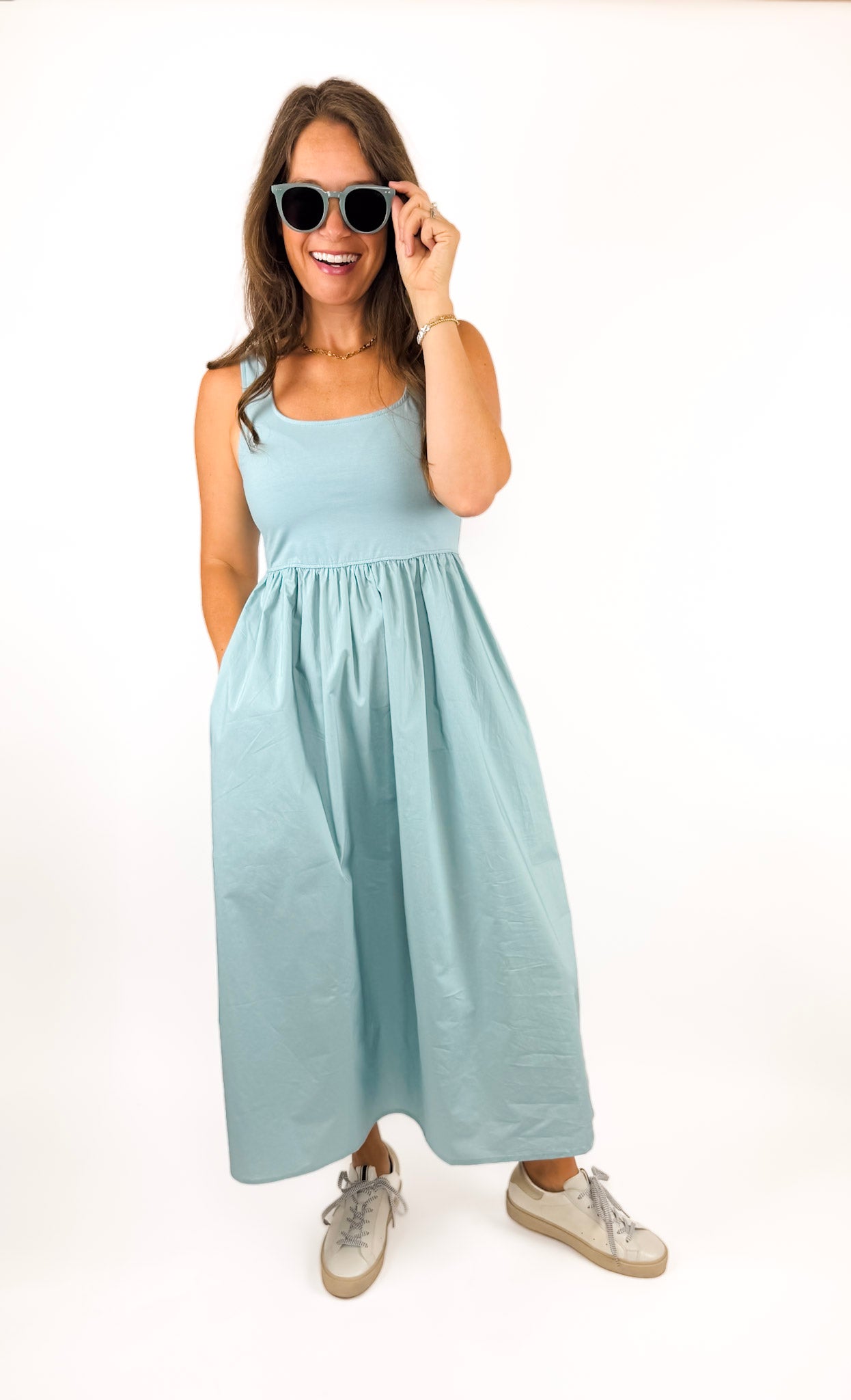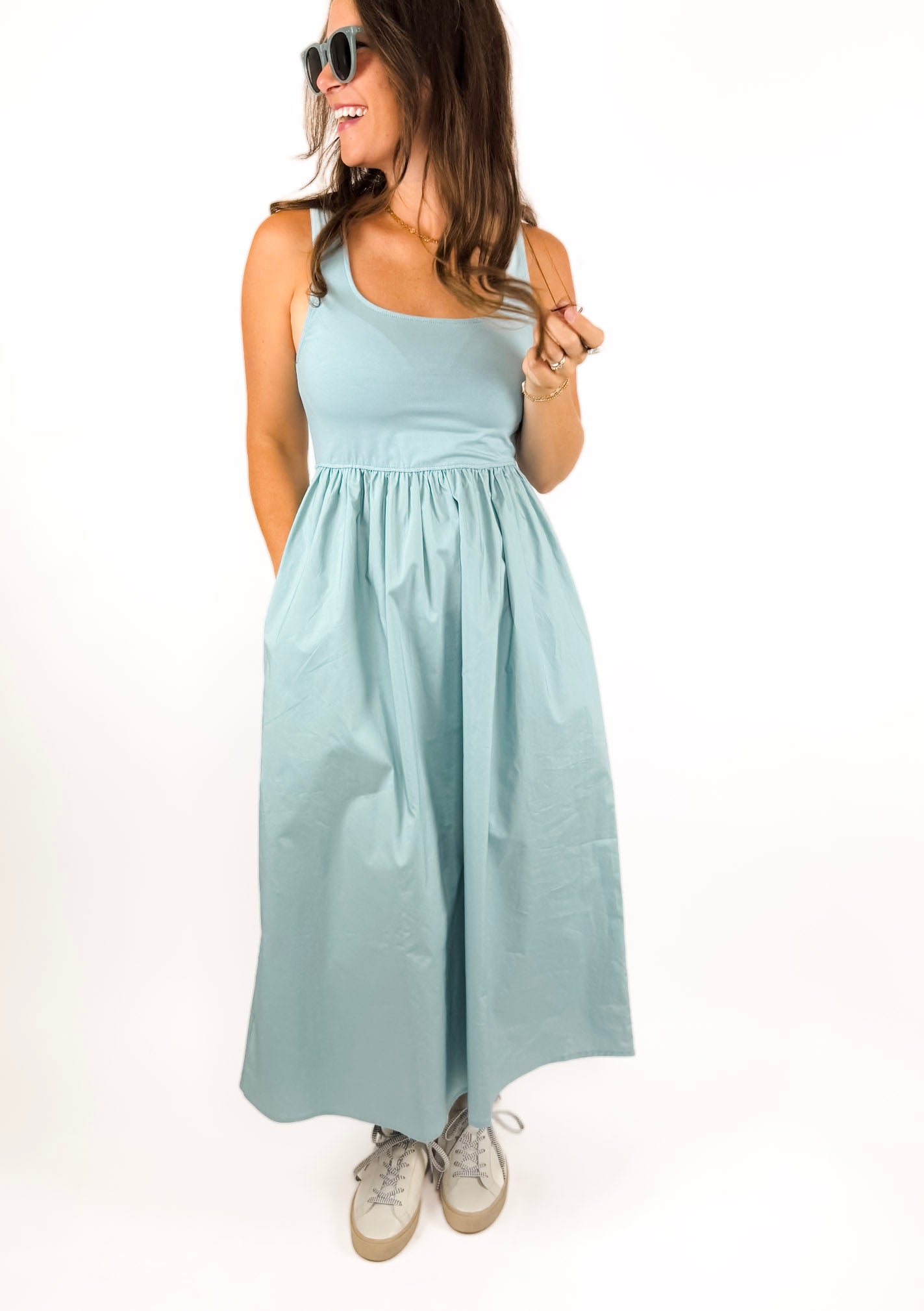 The most comfortable dress that is feminine and pretty! We love the stretchy bodice and the gorgeous color. This is the ultimate year-around dress with pockets! The mixed-media fabrics give it a special touch. Belt it to elevate it or just wear as is! Also available in black.