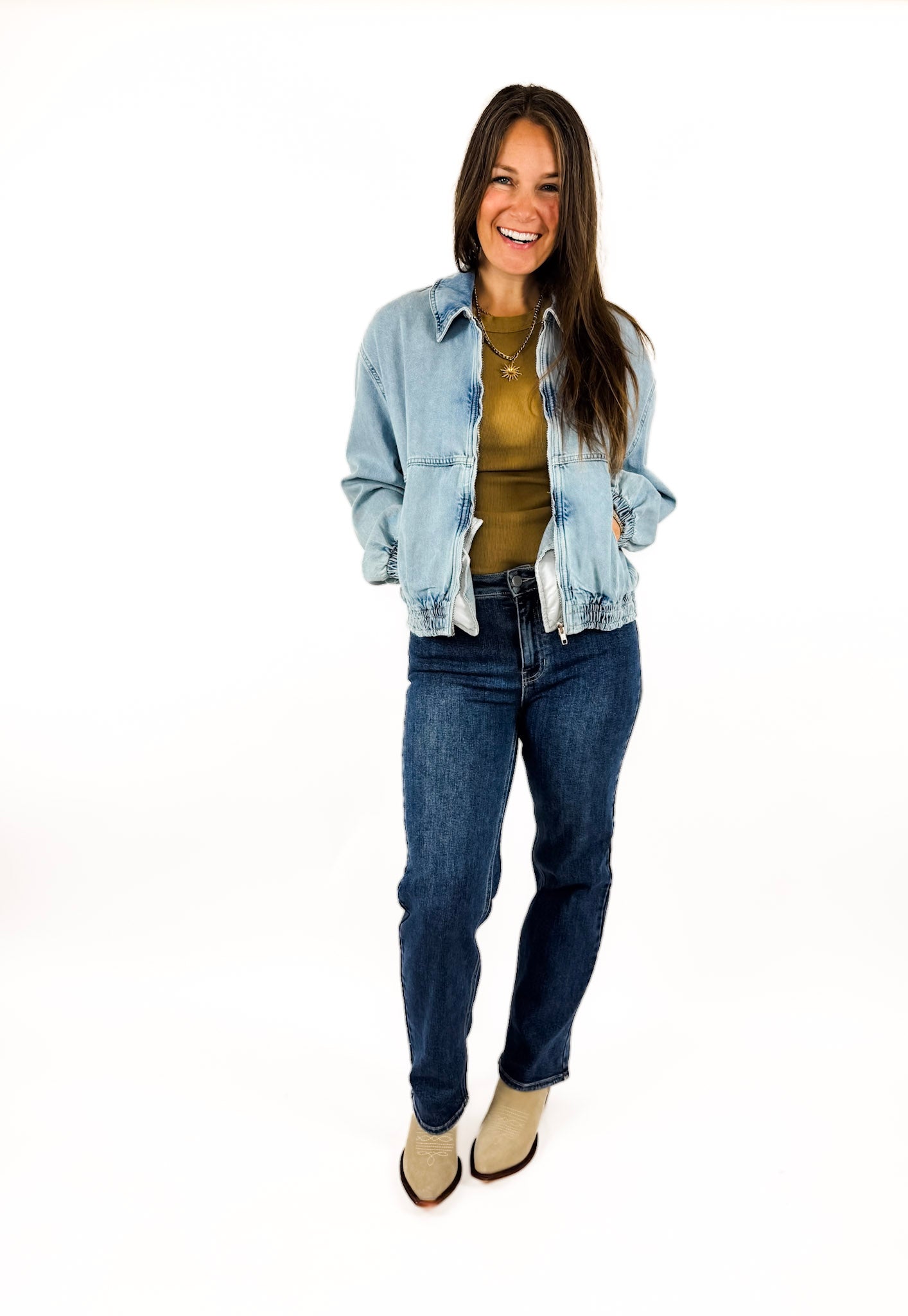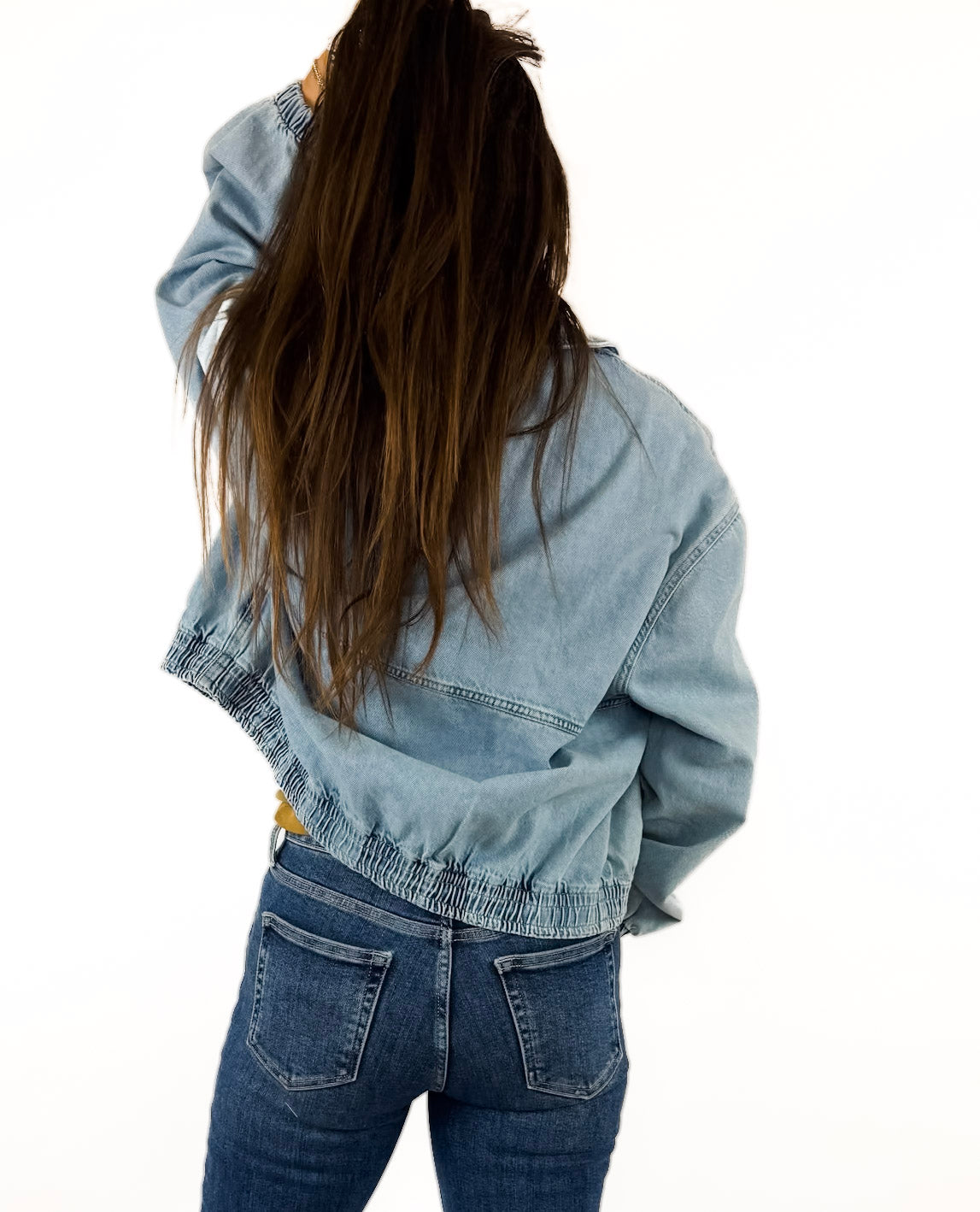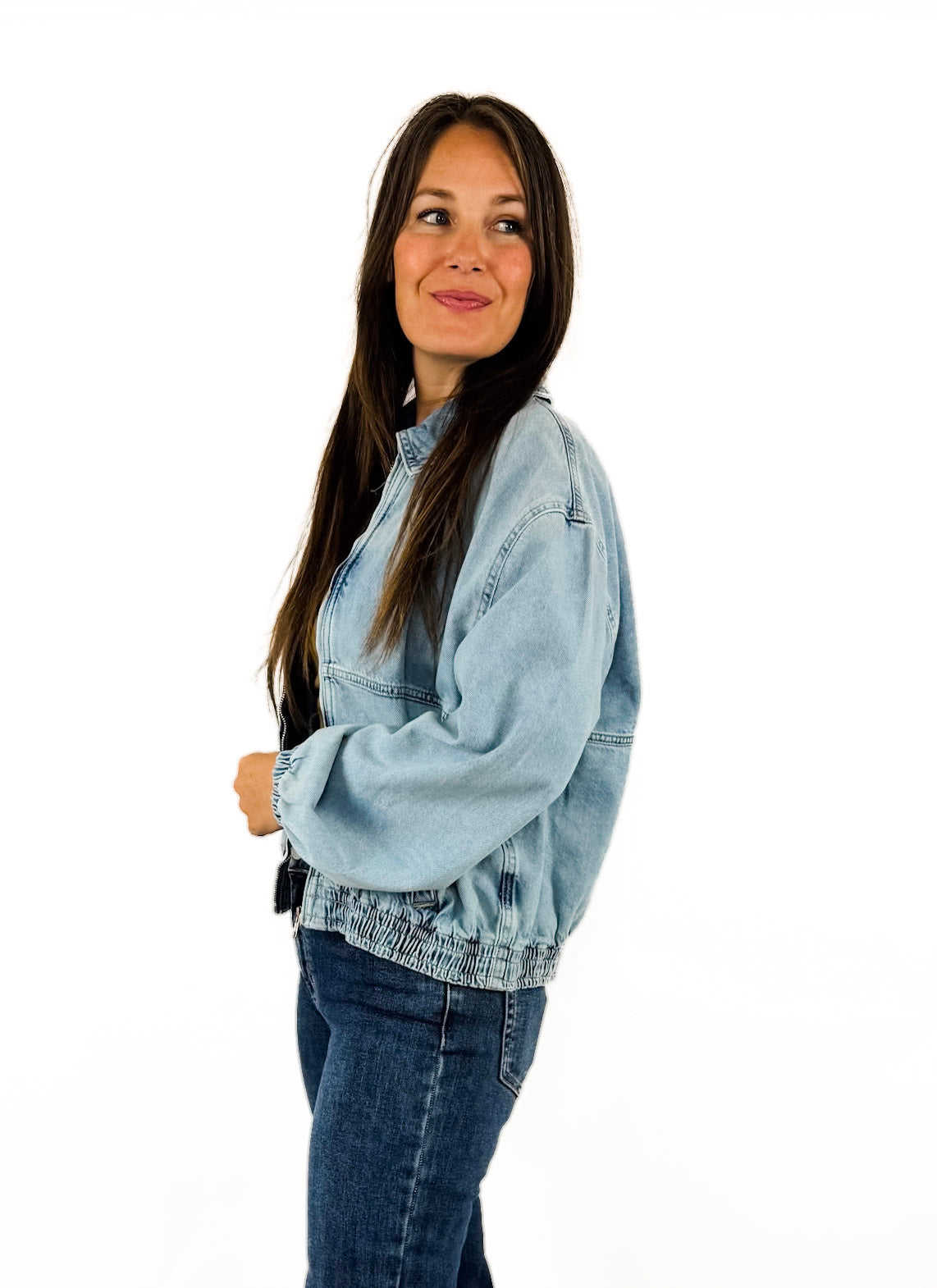 Immediate cool girl status. We cannot get enough of this cute jacket by free people! It's a modern take on a denim jacket with a cute bomber jacket style. It's comfy, roomy and looks cute with everything from dresses to activewear. Limited quantities available!