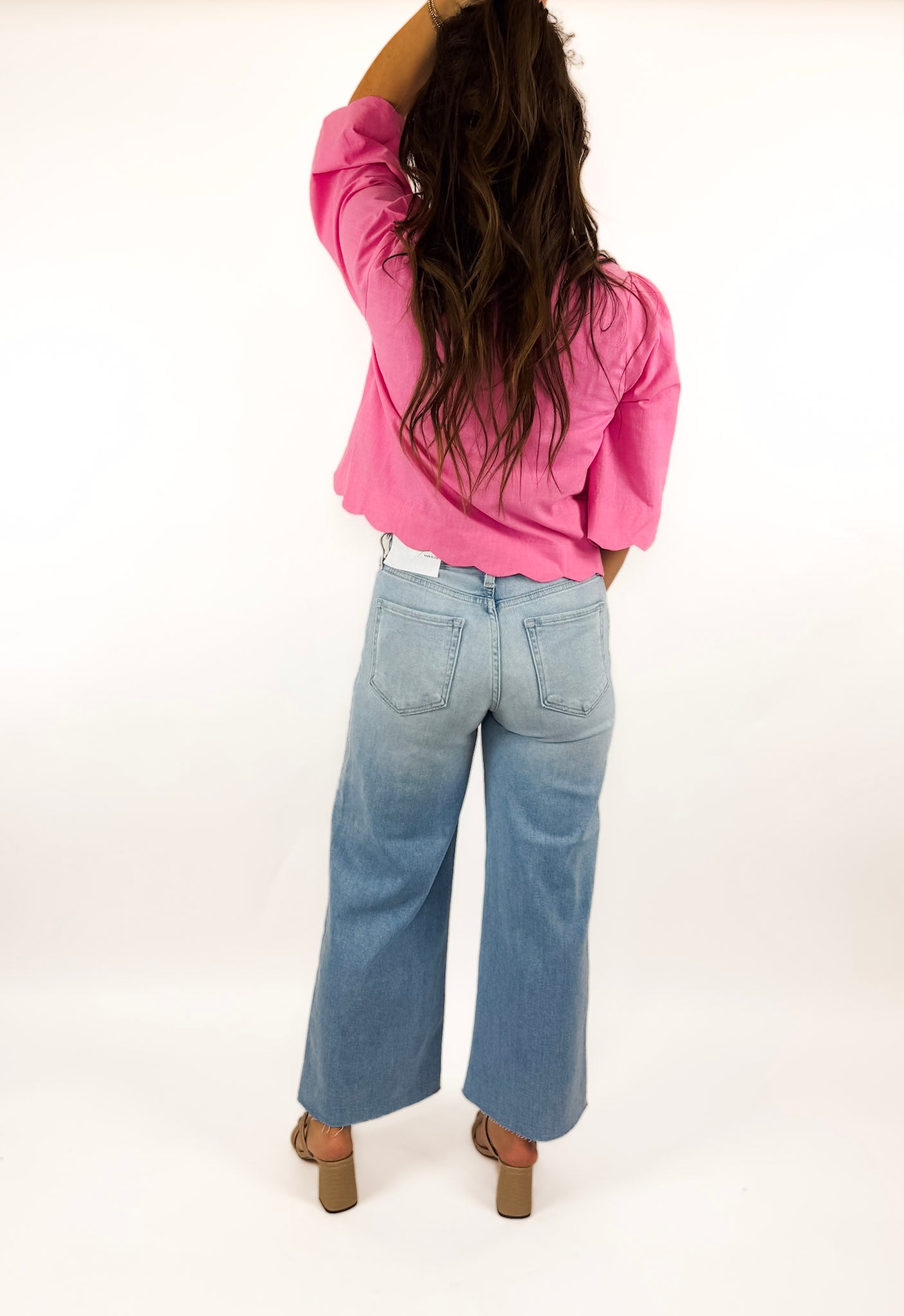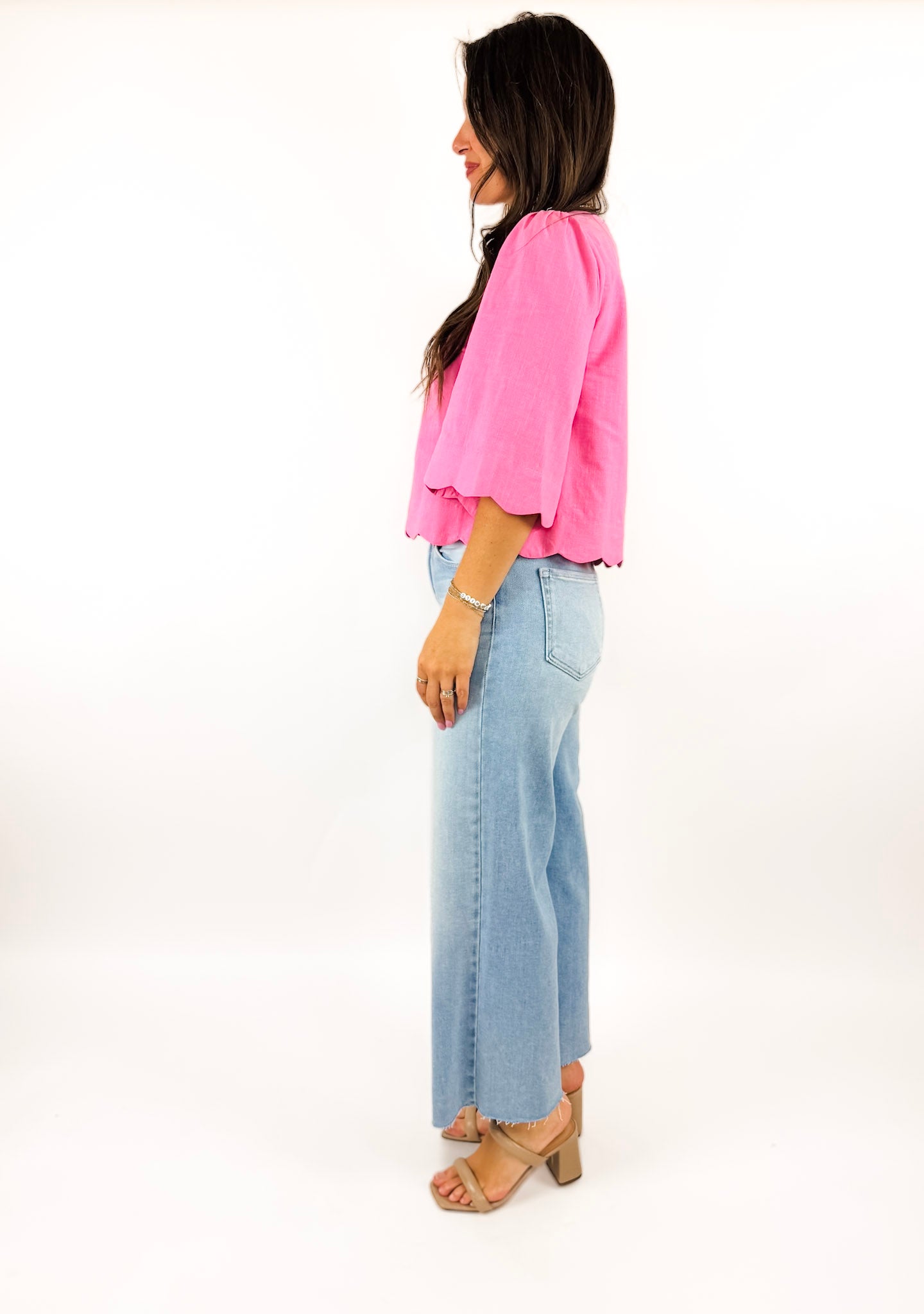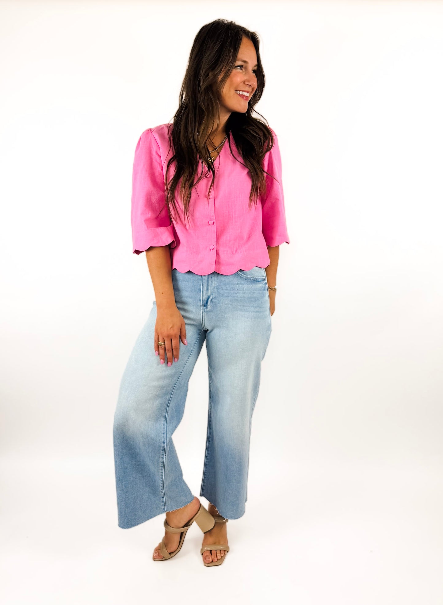 FUN and SO pretty. The Breanne blouse is a standalone top that makes a statement with a scalloped hem detail and a fun bubblegum pink color. Style it with jeans for everyday or trousers for work!