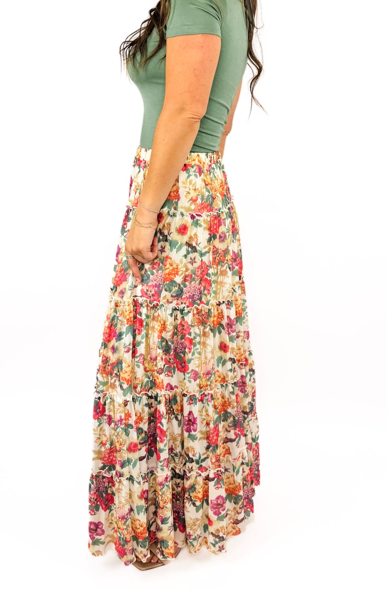 This stretchy mesh fabric has been on trend, but also just a comfortable favorite around here! We love how flowy this piece is and the floral is a gorgeous colorway that can be styled year around.