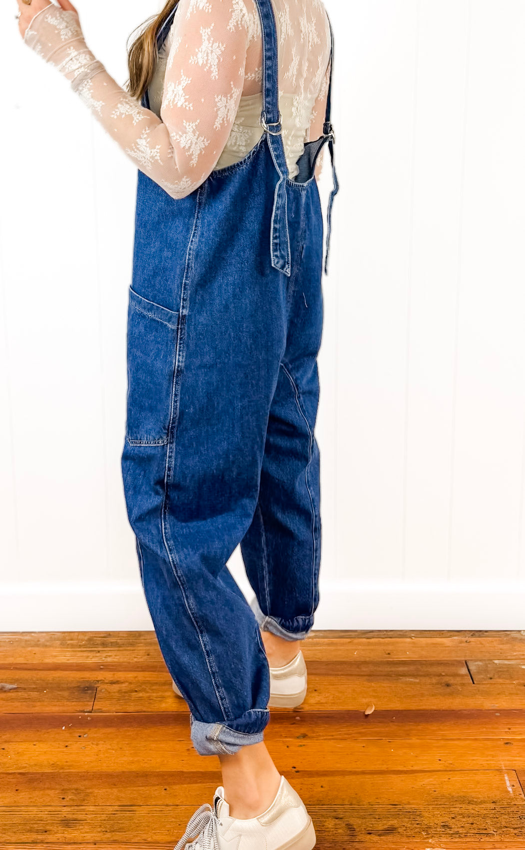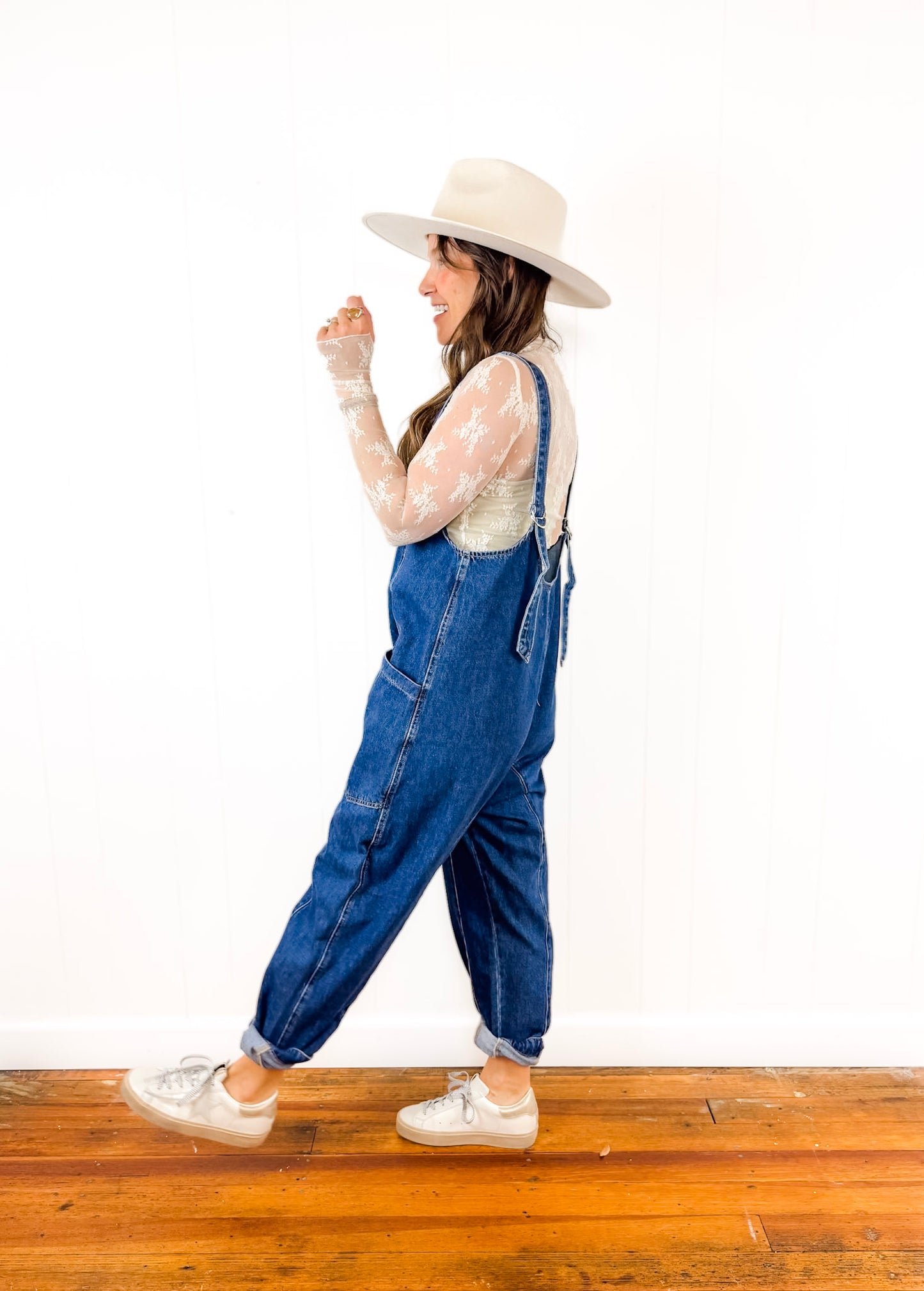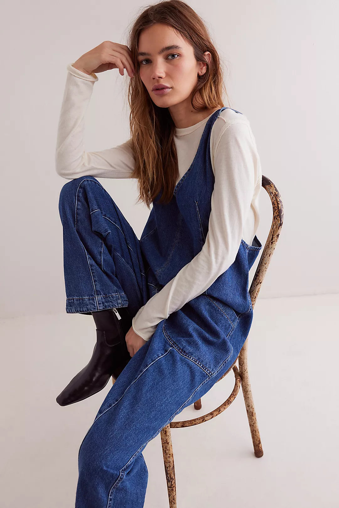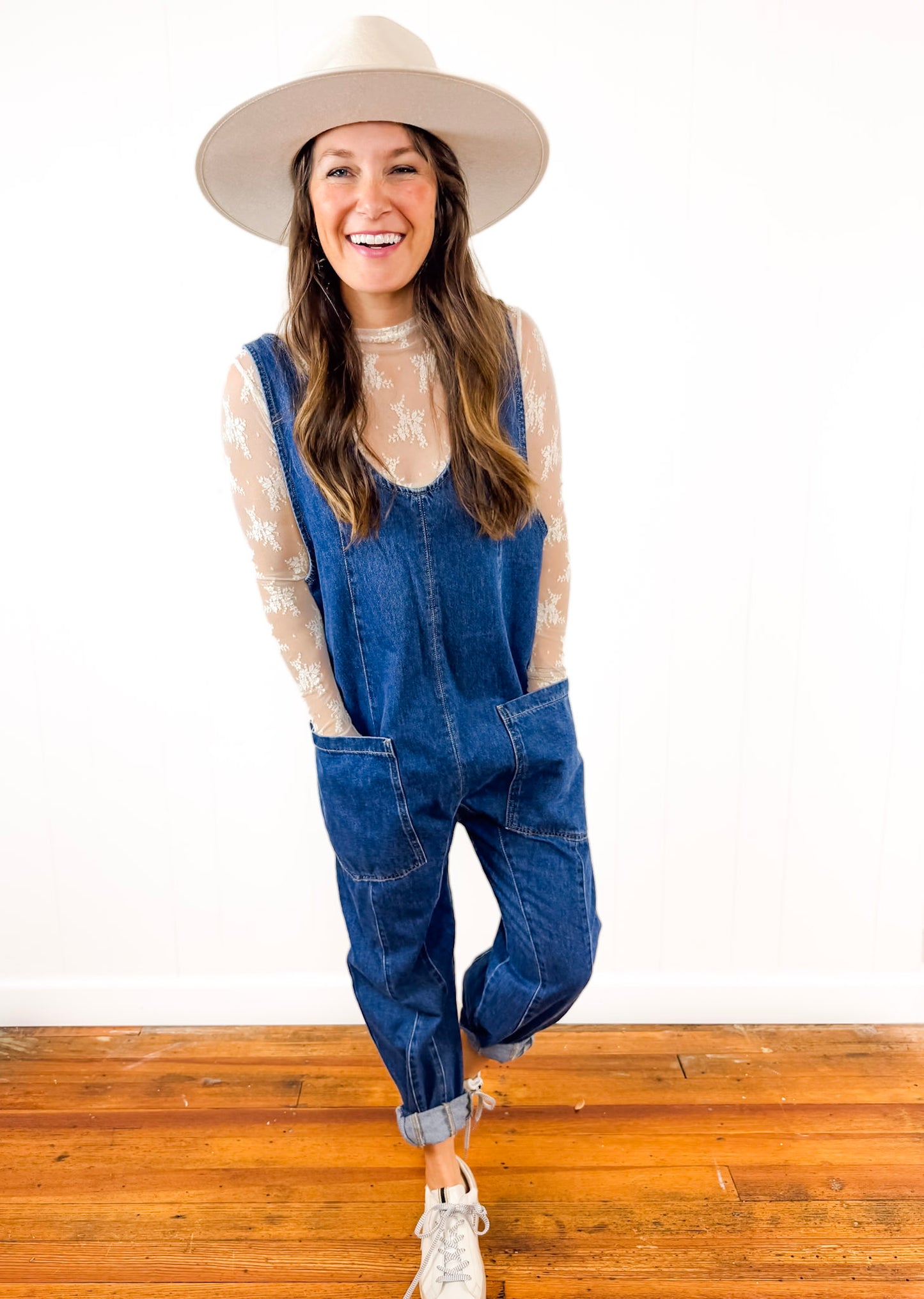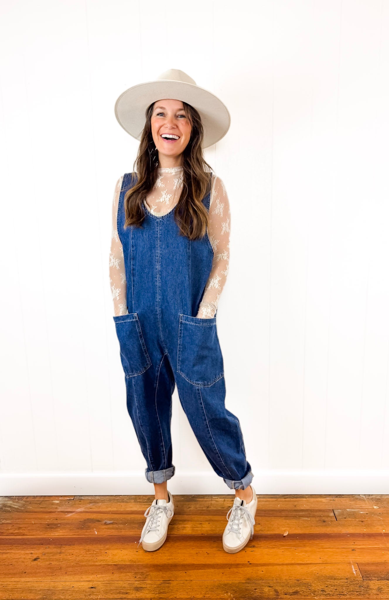 The viral jumpsuit has hit flower wild again! This free people one-and-done outfit is a must-have for its relaxed and effortless feel. This denim jumpsuit is a relaxed fit with a cropped ankle-length style + harem legs and a low scoop neckline. Also available in mineral black. Styled with cream lady luxe top, billie hat and reba sneakers.