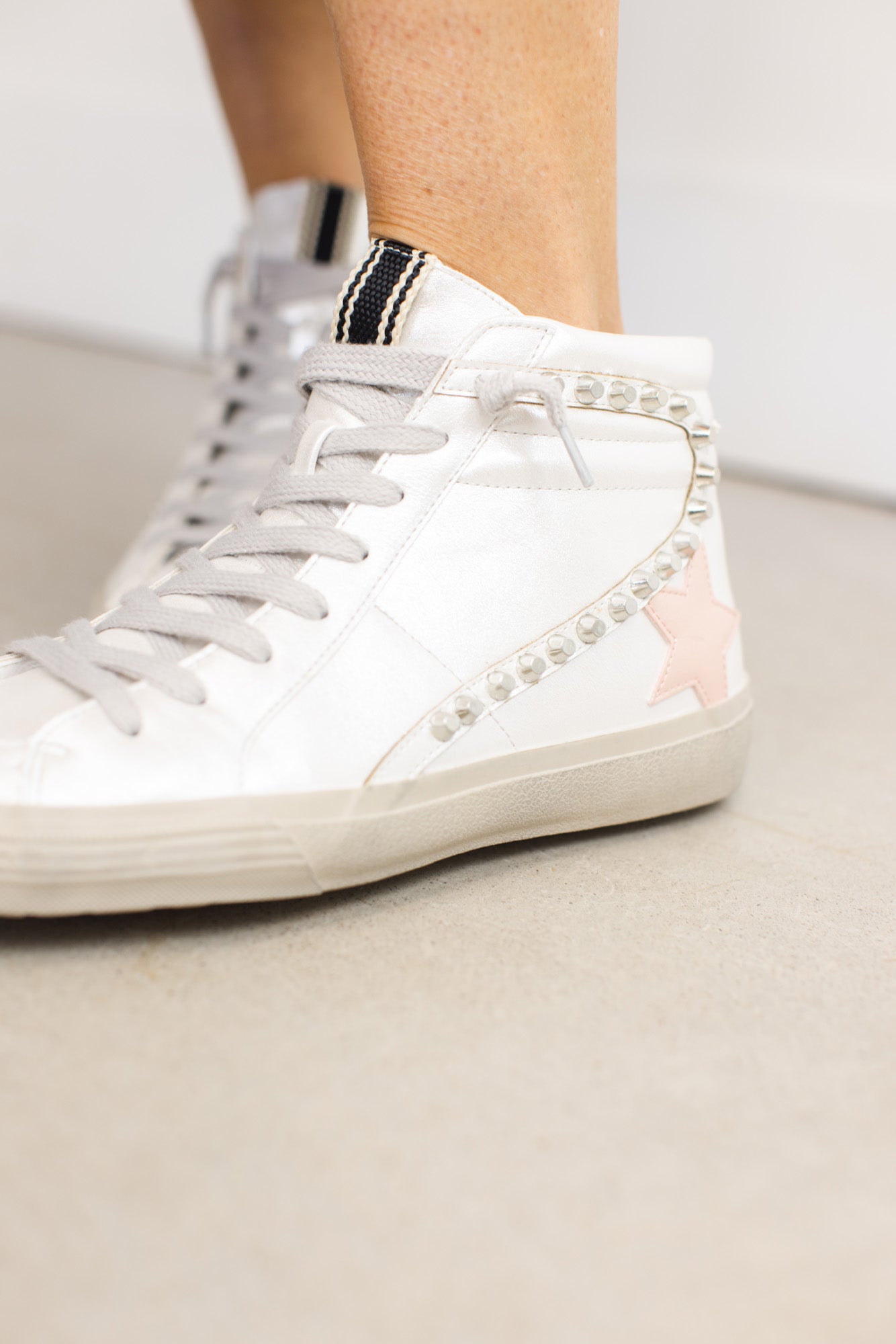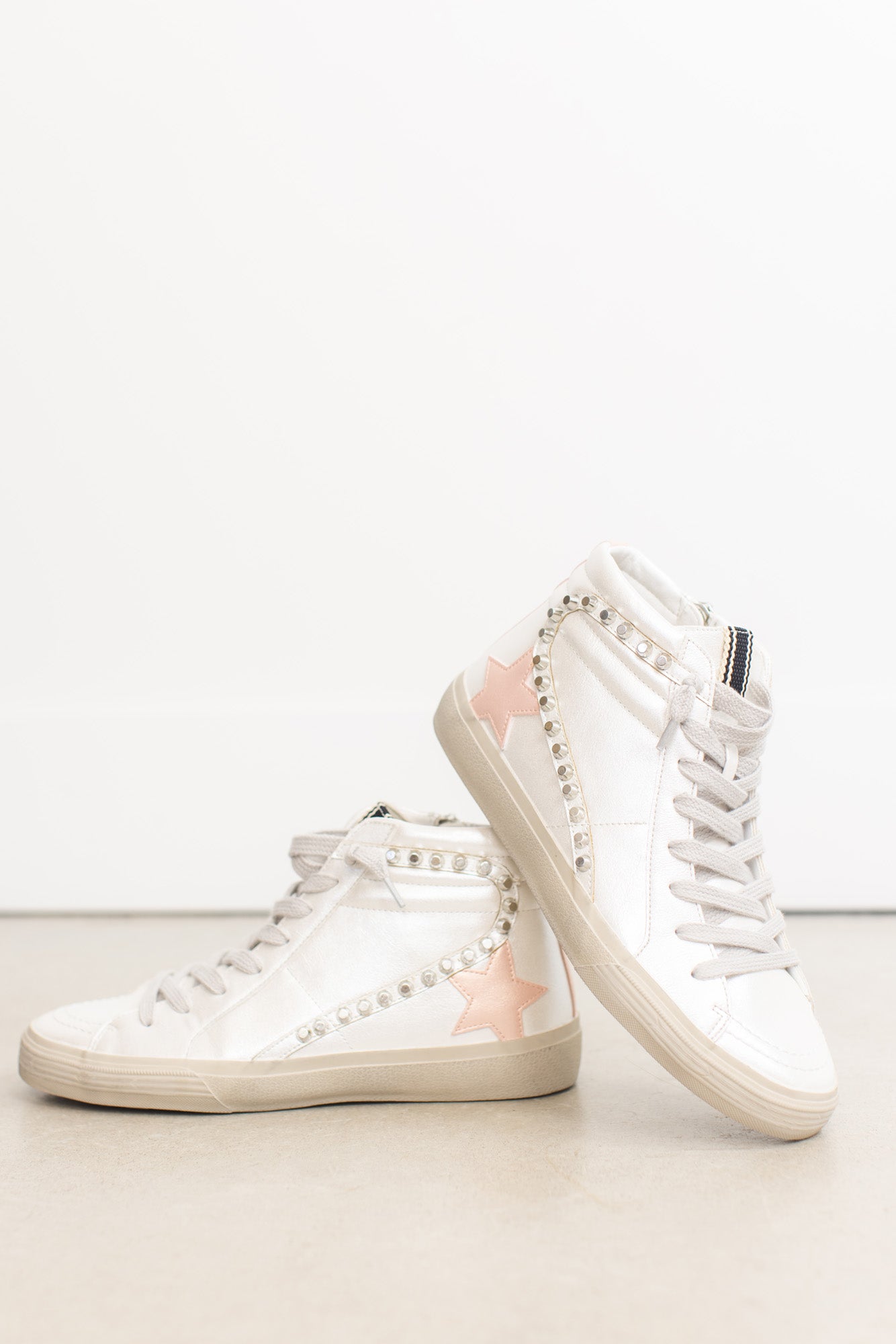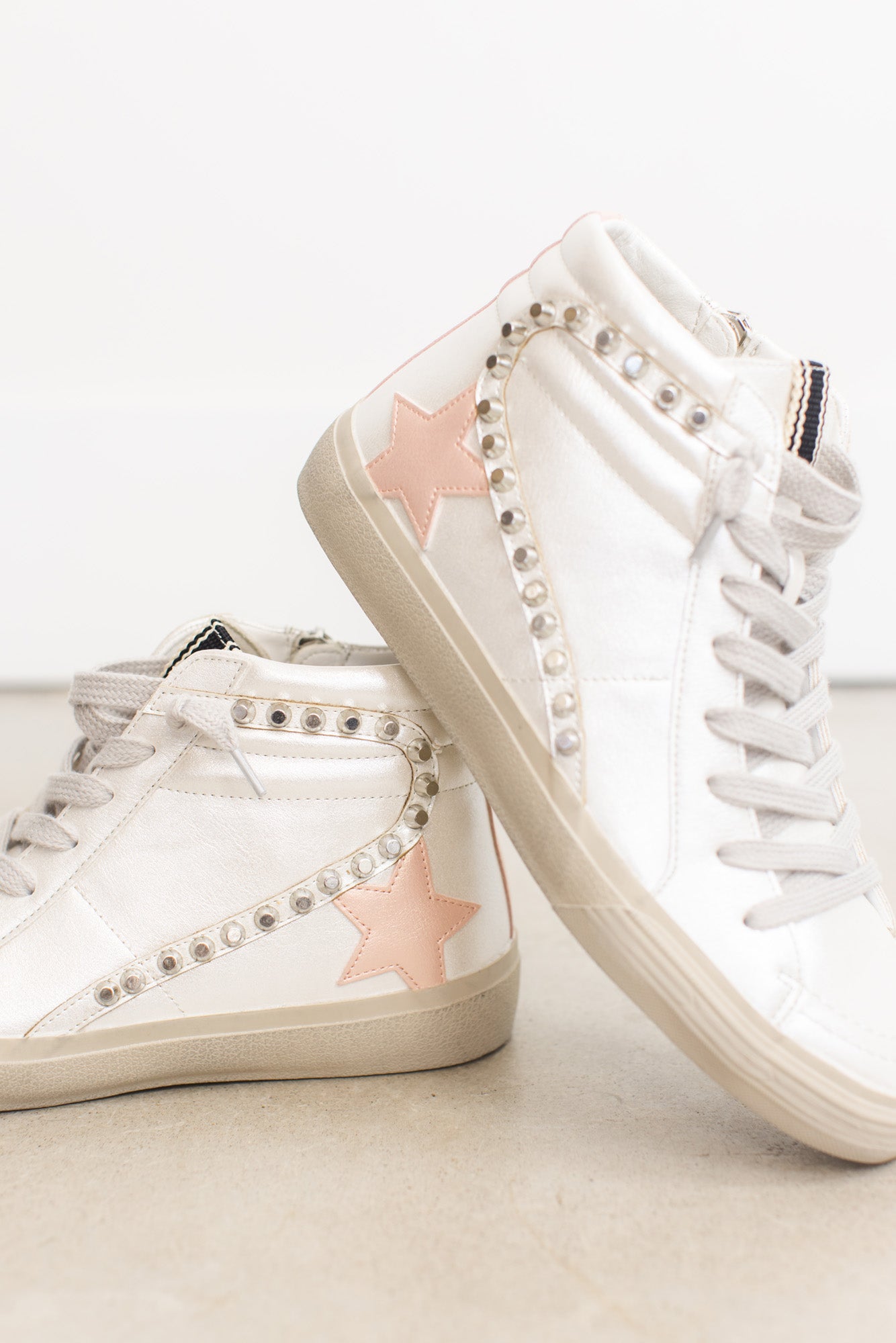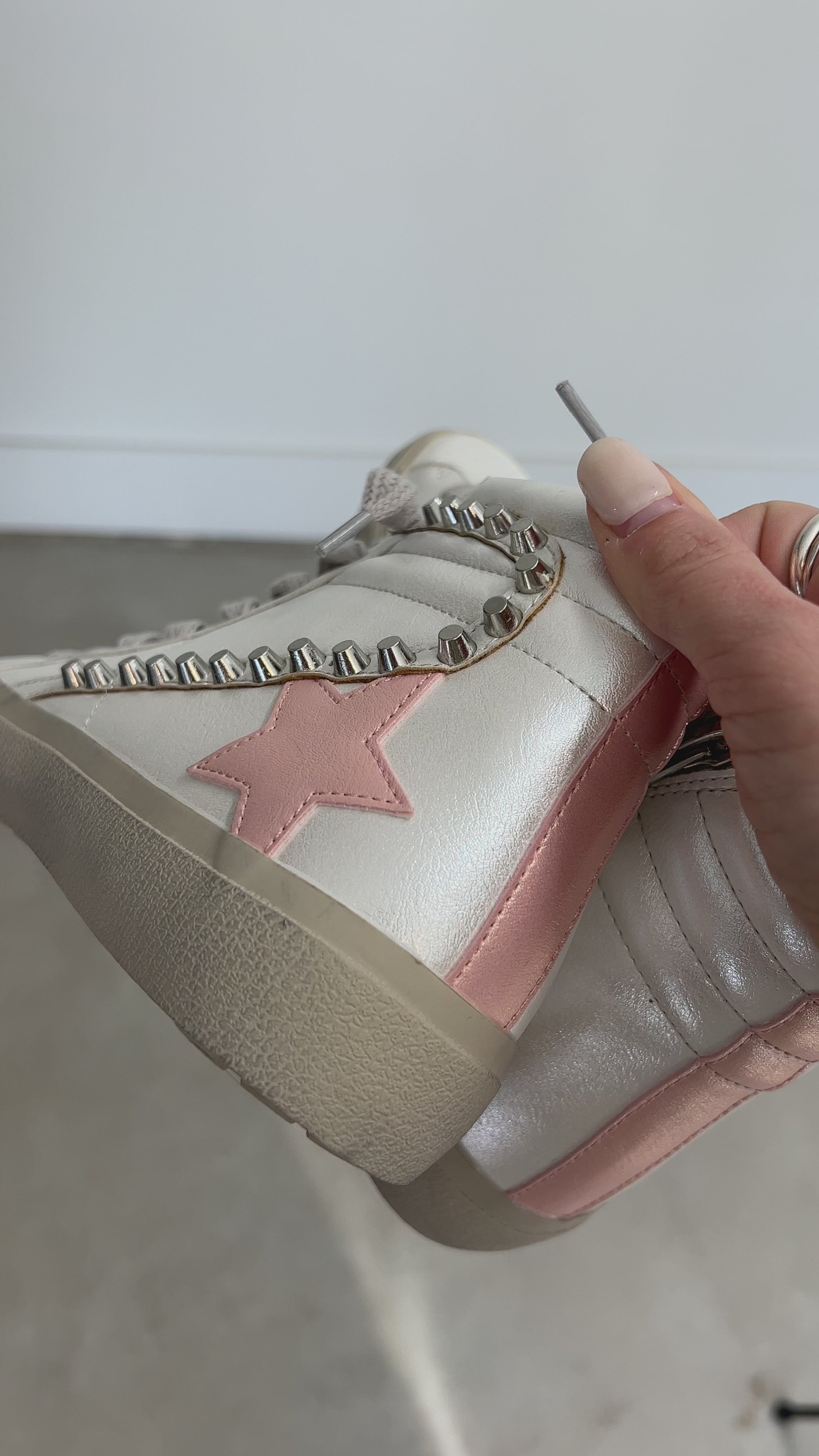 Preppy soft pink mixed with grunge metal details gives a chic rock'n'roll attitude. We LOVE the pearly white shoe with the pearl finish pink star as well. You can literally add these shoes to any outfit, any occasion, and any length of pants, dress, or skirt. A