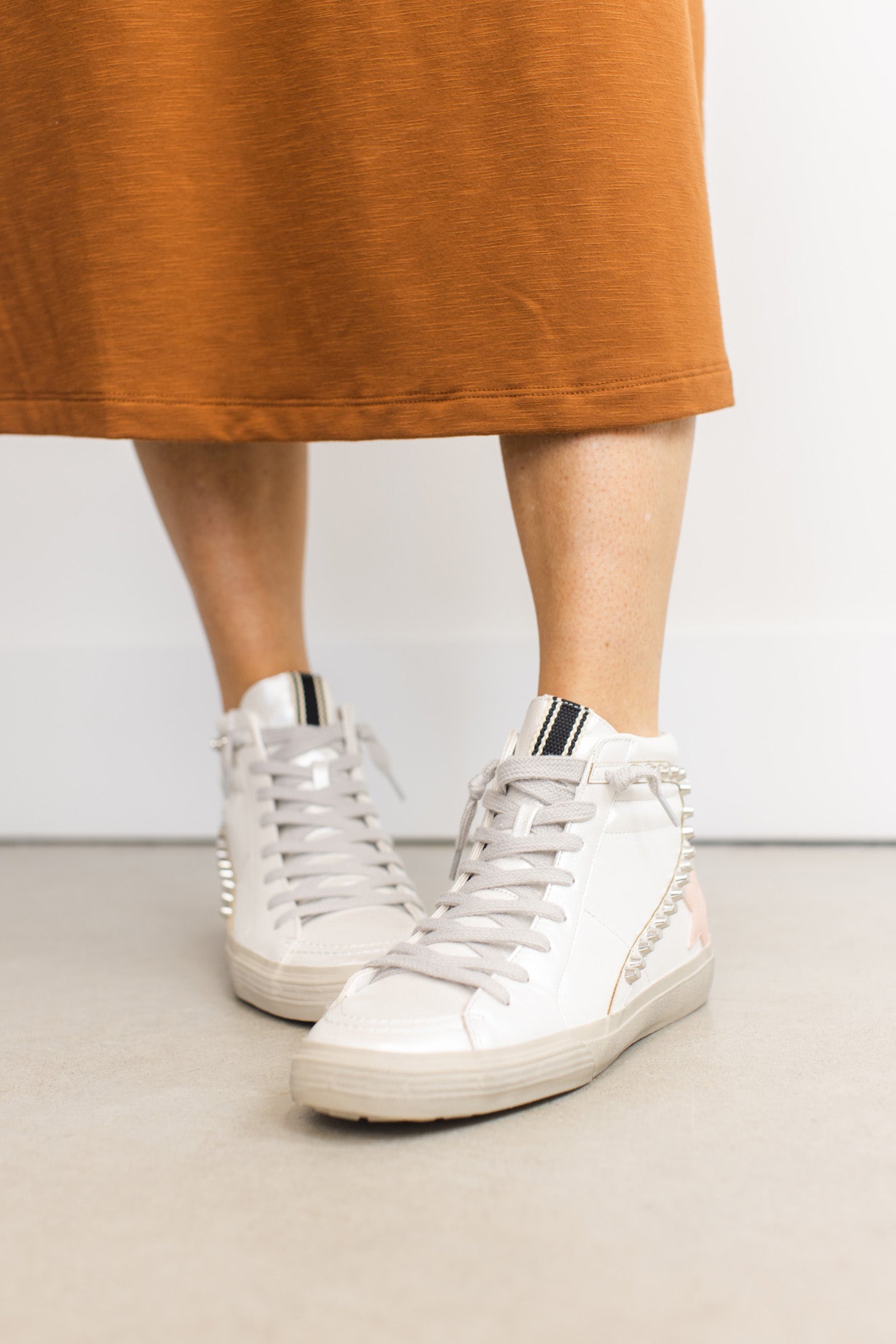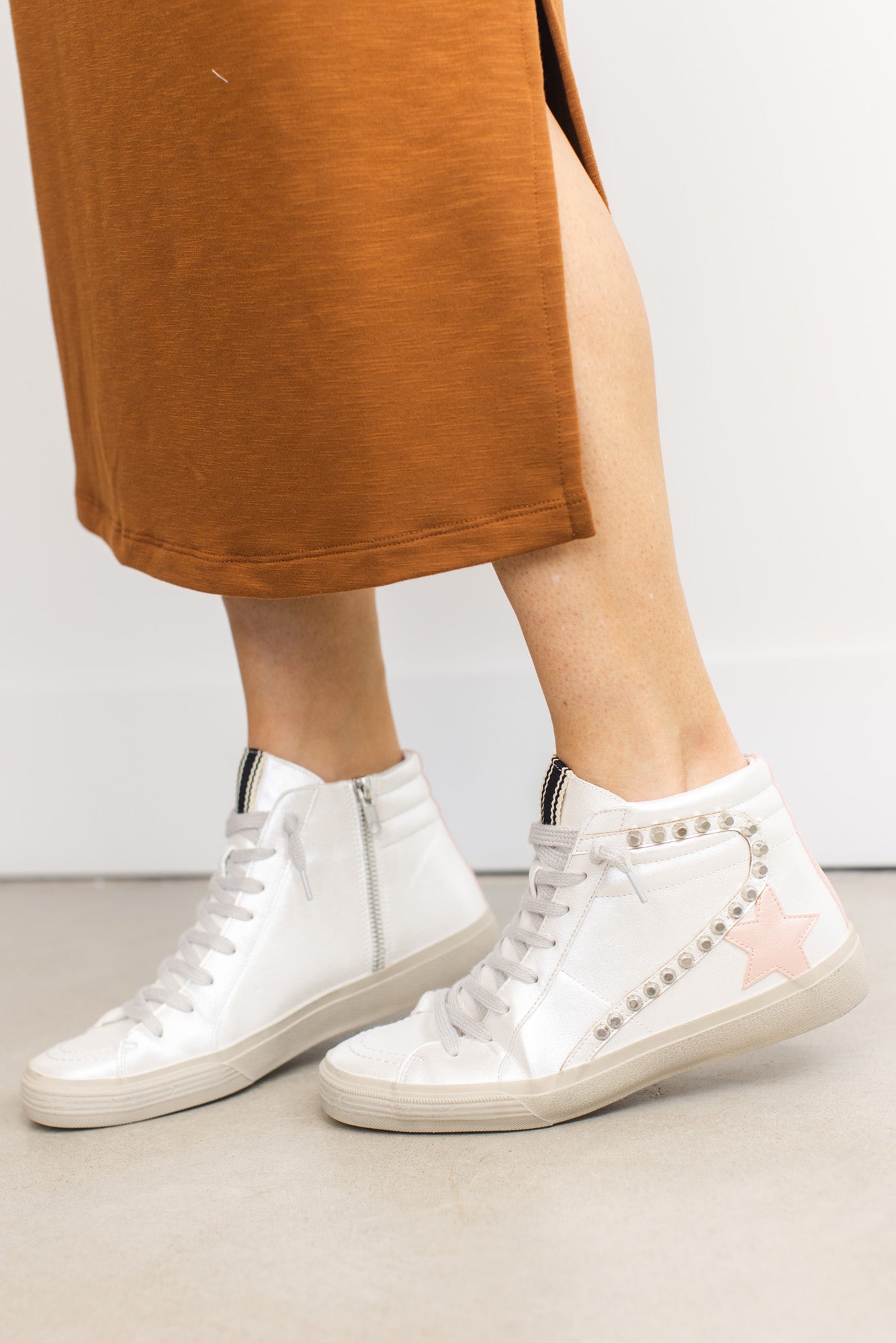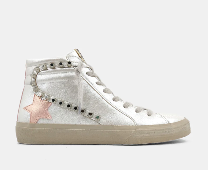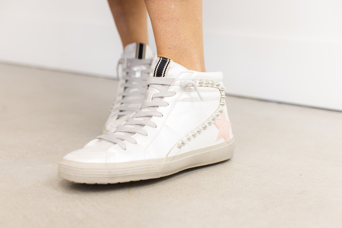 Preppy soft pink mixed with grunge metal details gives a chic rock'n'roll attitude. We LOVE the pearly white shoe with the pearl finish pink star as well. You can literally add these shoes to any outfit, any occasion, and any length of pants, dress, or skirt. A
