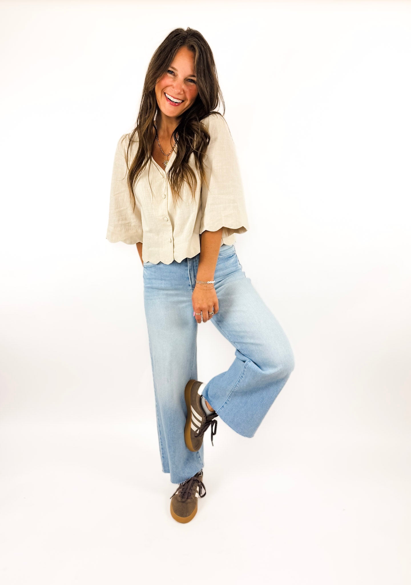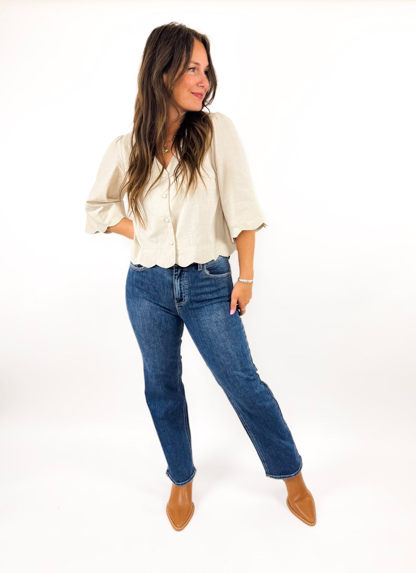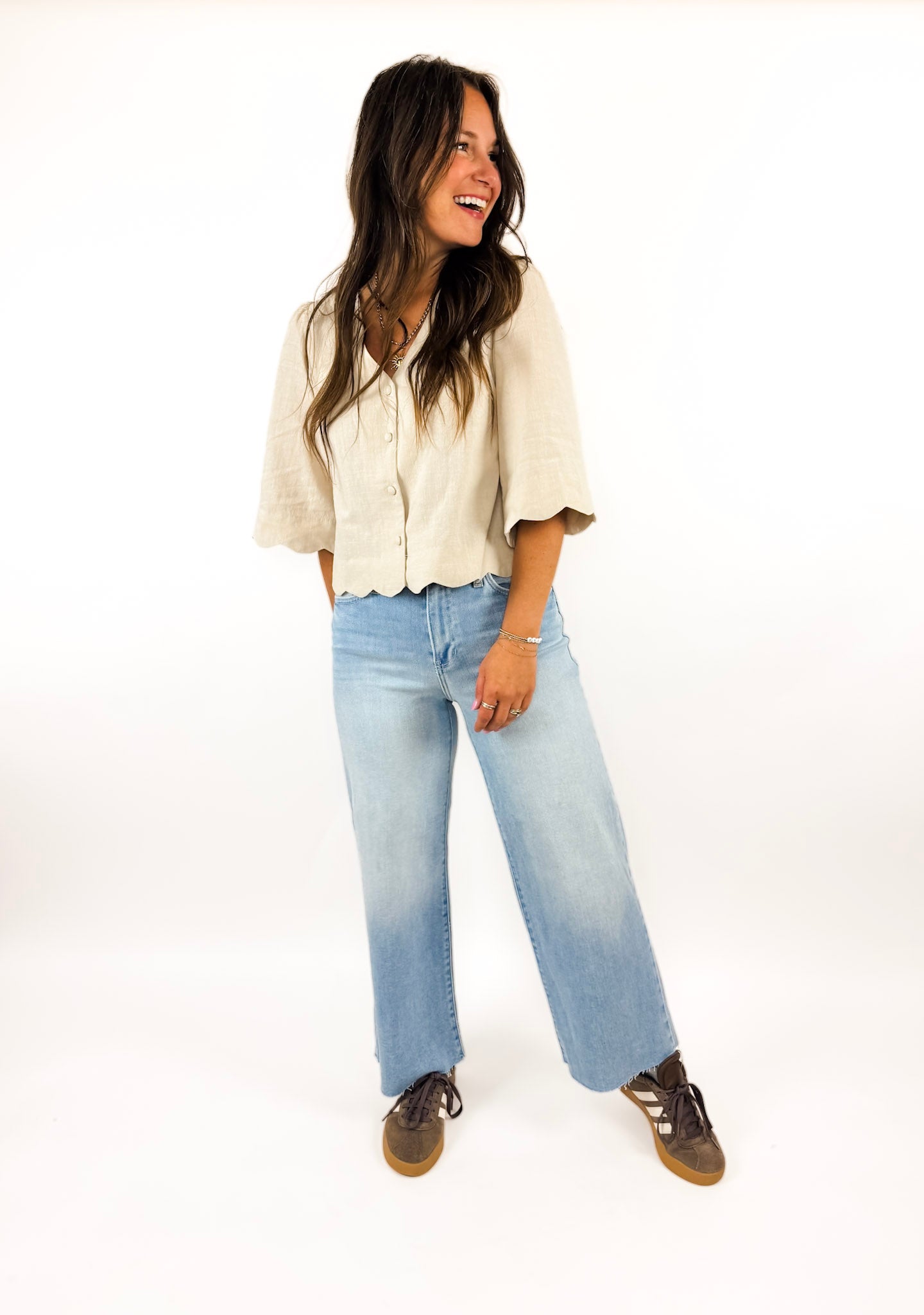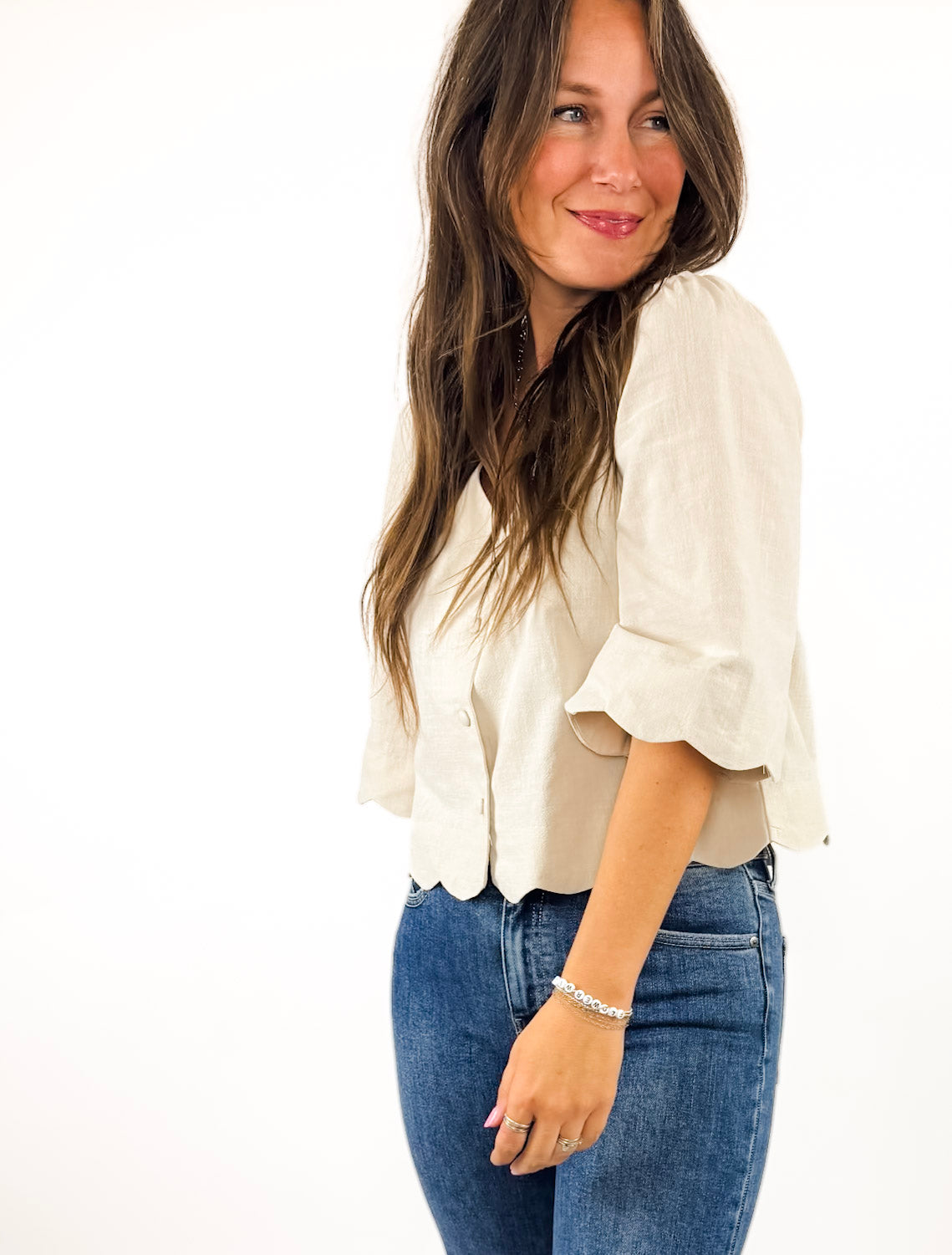 FUN details and SO pretty. The Breanne blouse is a standalone top that makes a statement with a scalloped hem detail and a perfectly neutral color. Style it with jeans for everyday or trousers for work! Also available in pink.