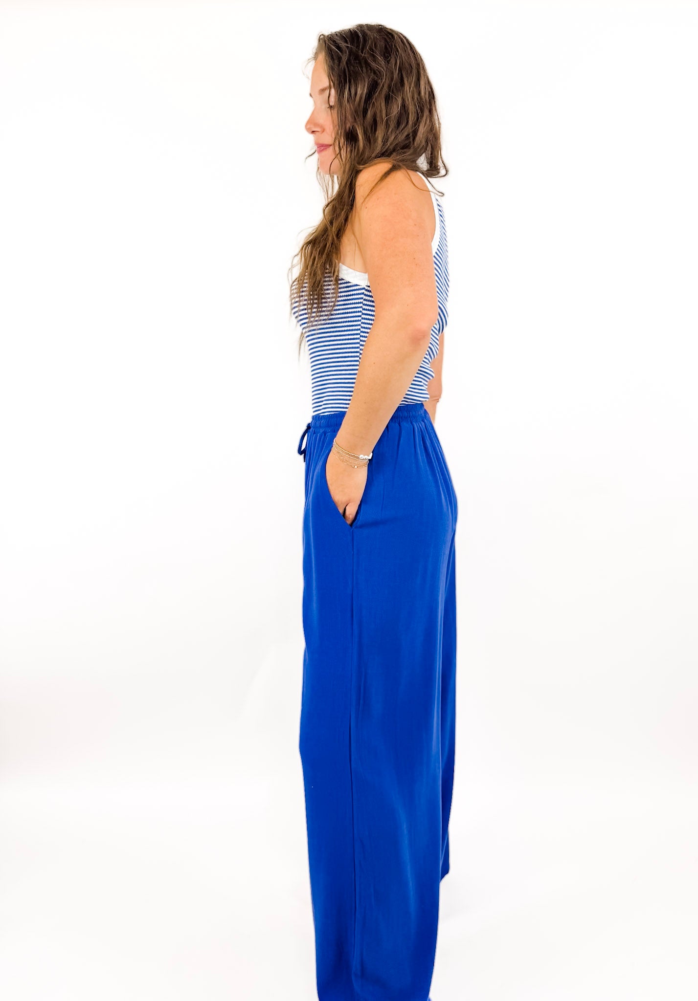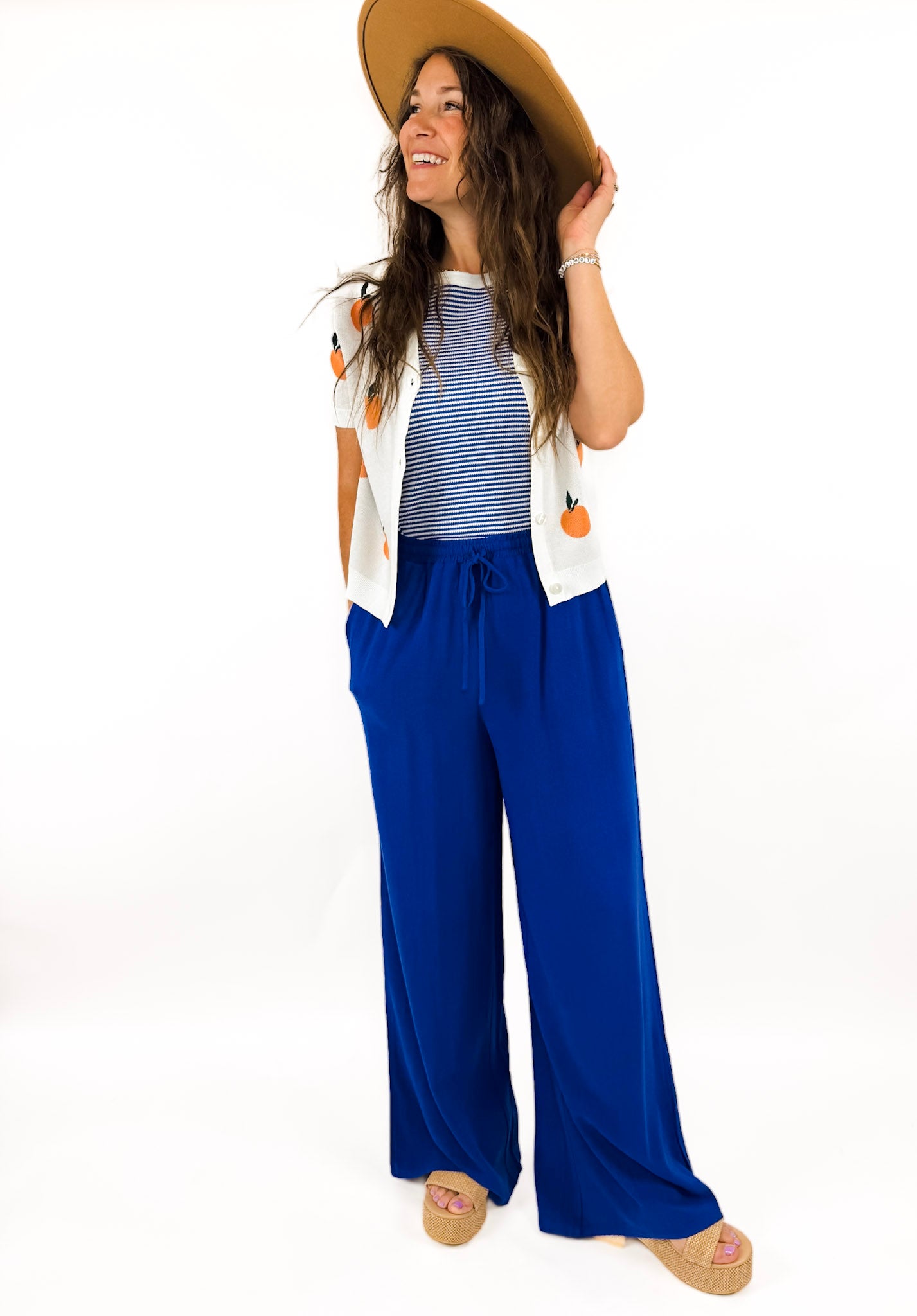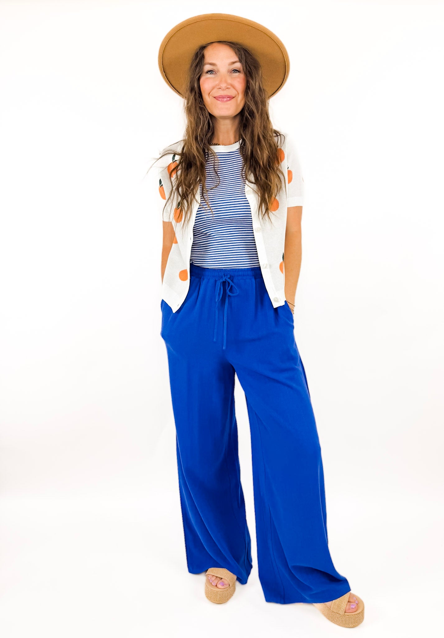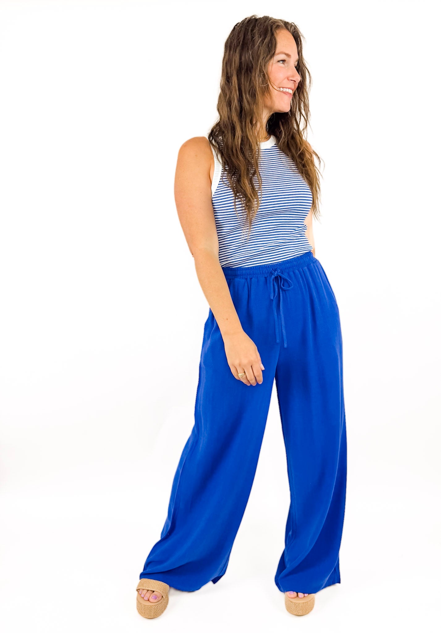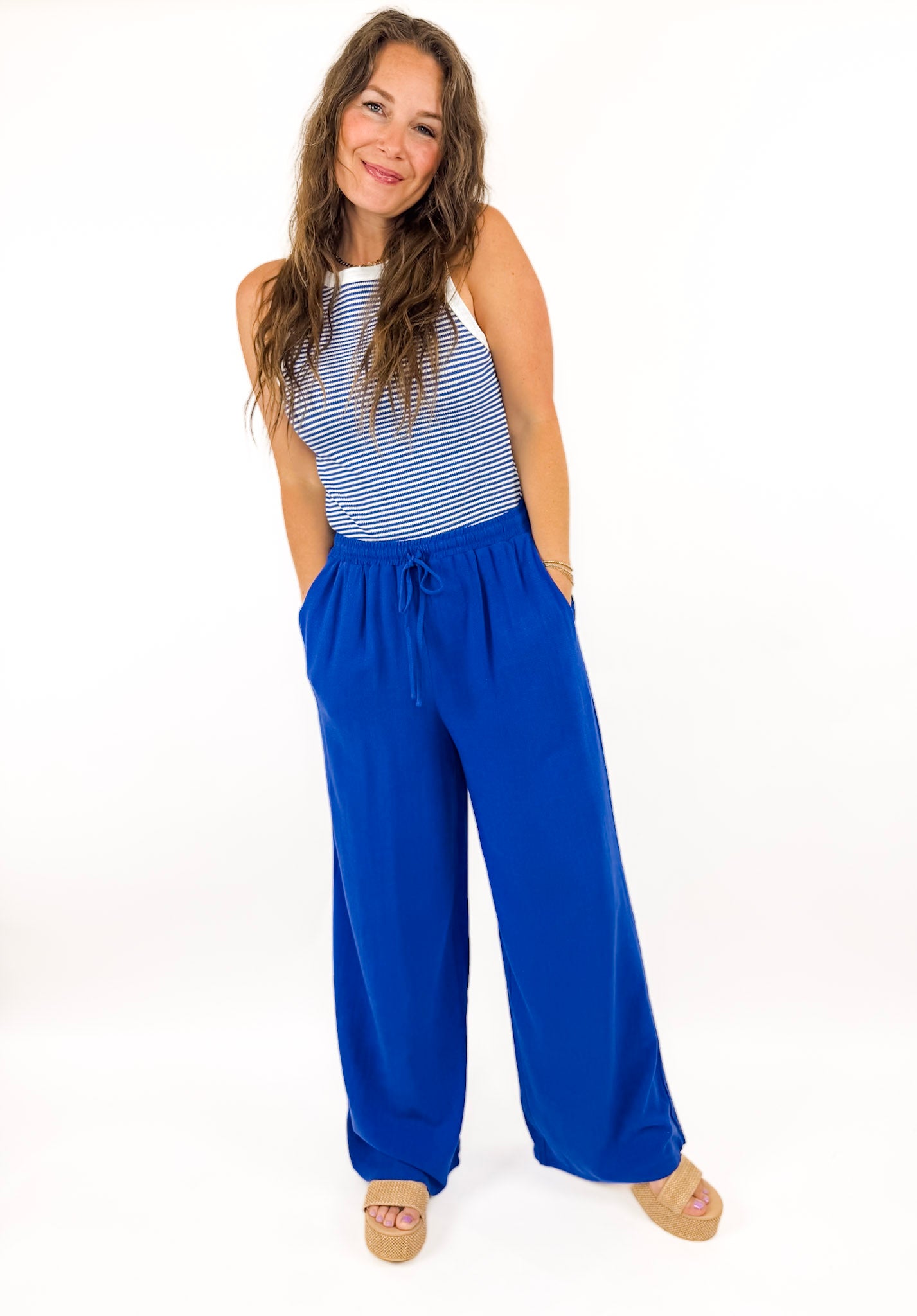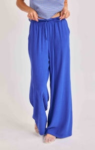 A classic breezy pant that you can style so many ways. Comfortable and easy to dress up or down. Perfect styled with the ocean avenue wedges and palma tank or the brandy tee.