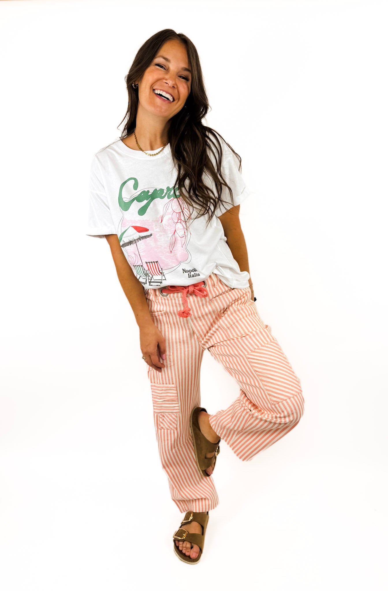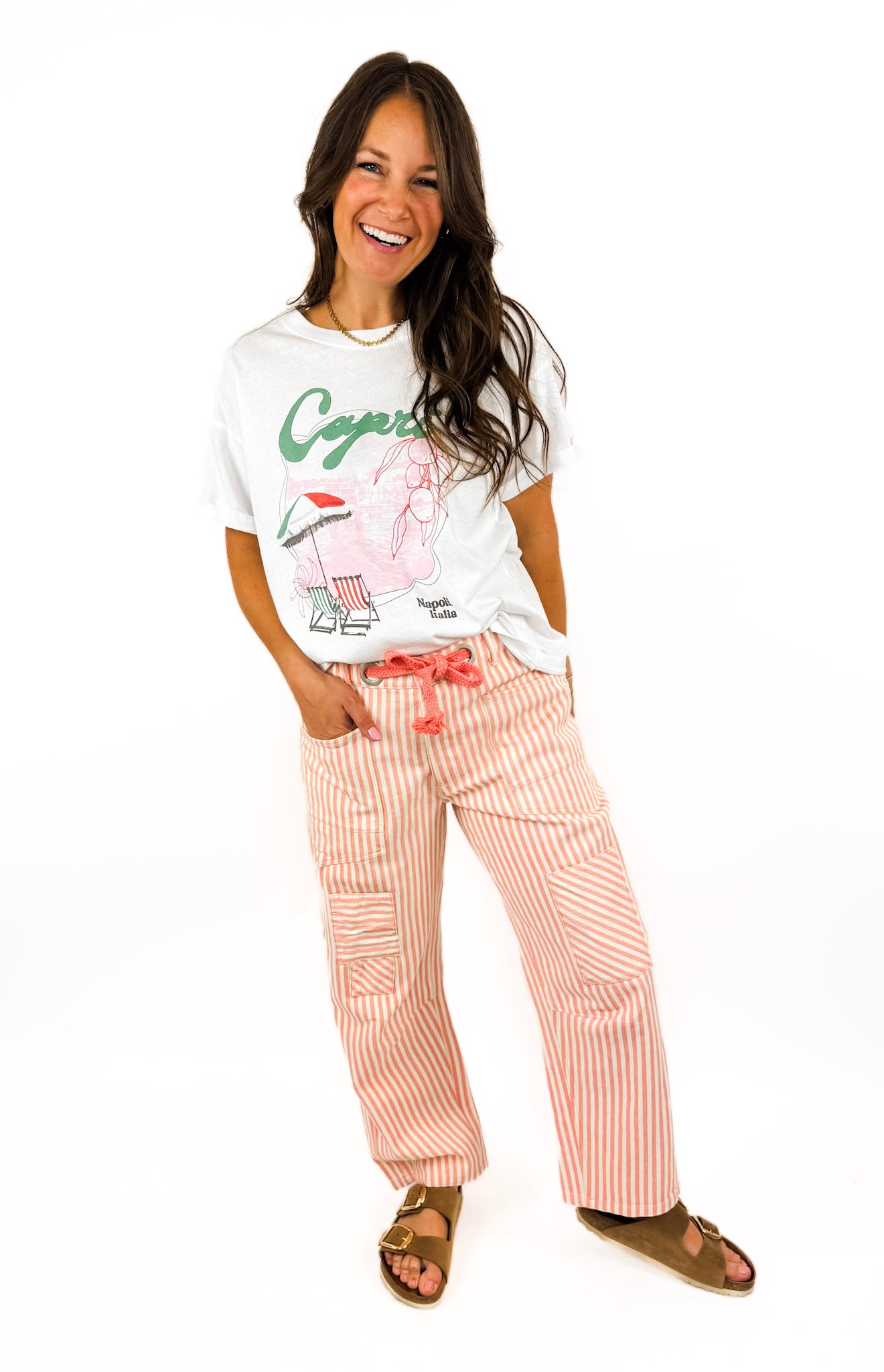 Styled here with coral stipe patchwork pant and catalina slide.
