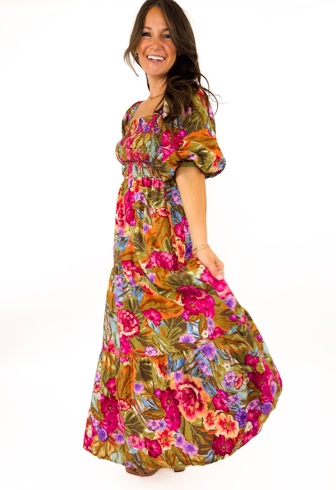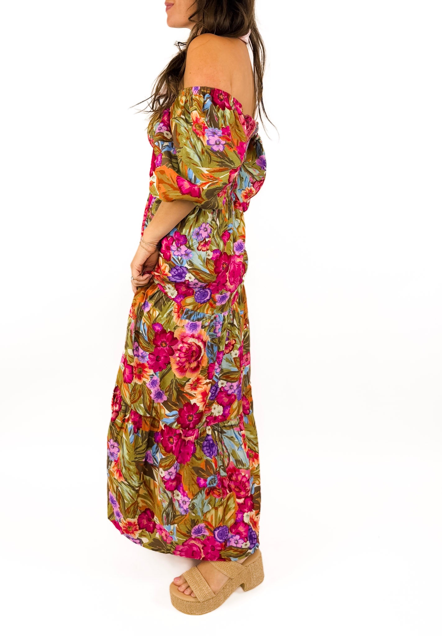 A stunning dress that we can't wait to wear to every event this spring & summer. Wear it on or off the shoulders and tie on a bandana to finish the look. Breathable fabric and smocked bodice for an easy + flattering fit.