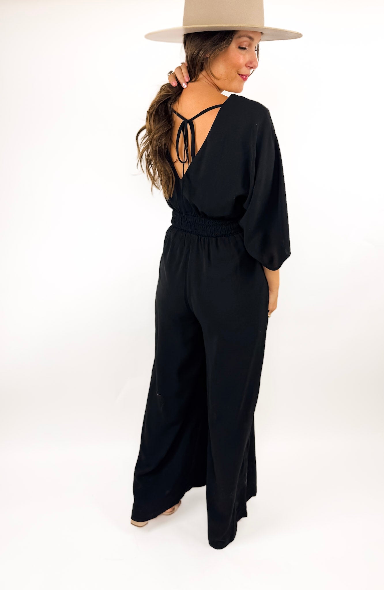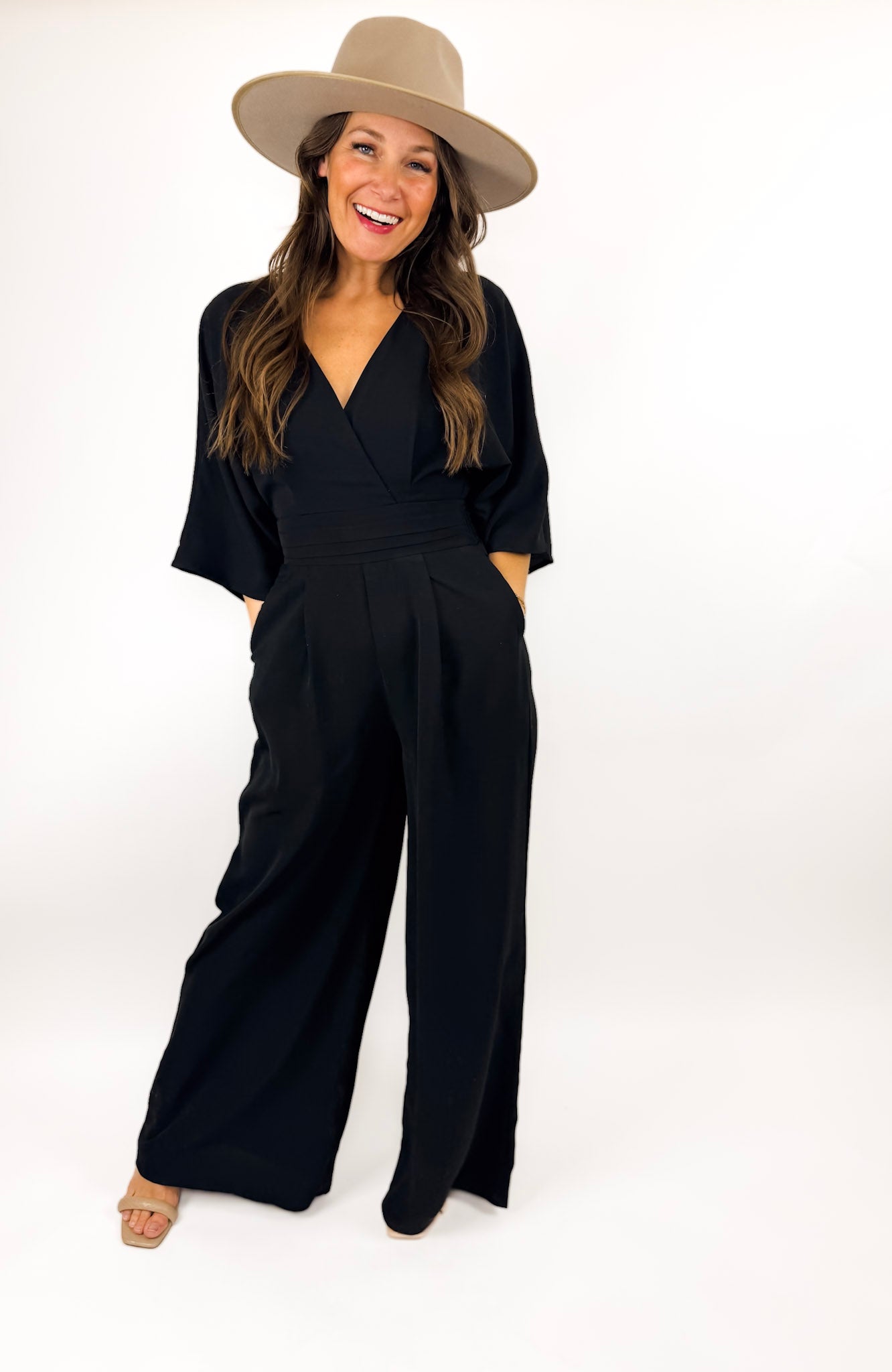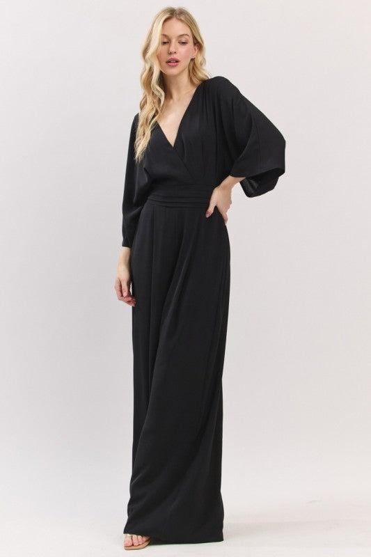 A lovely jumpsuit that is flattering and fun. It's luxe and can be dressed up or down so easily. Available in black, wine, and green.