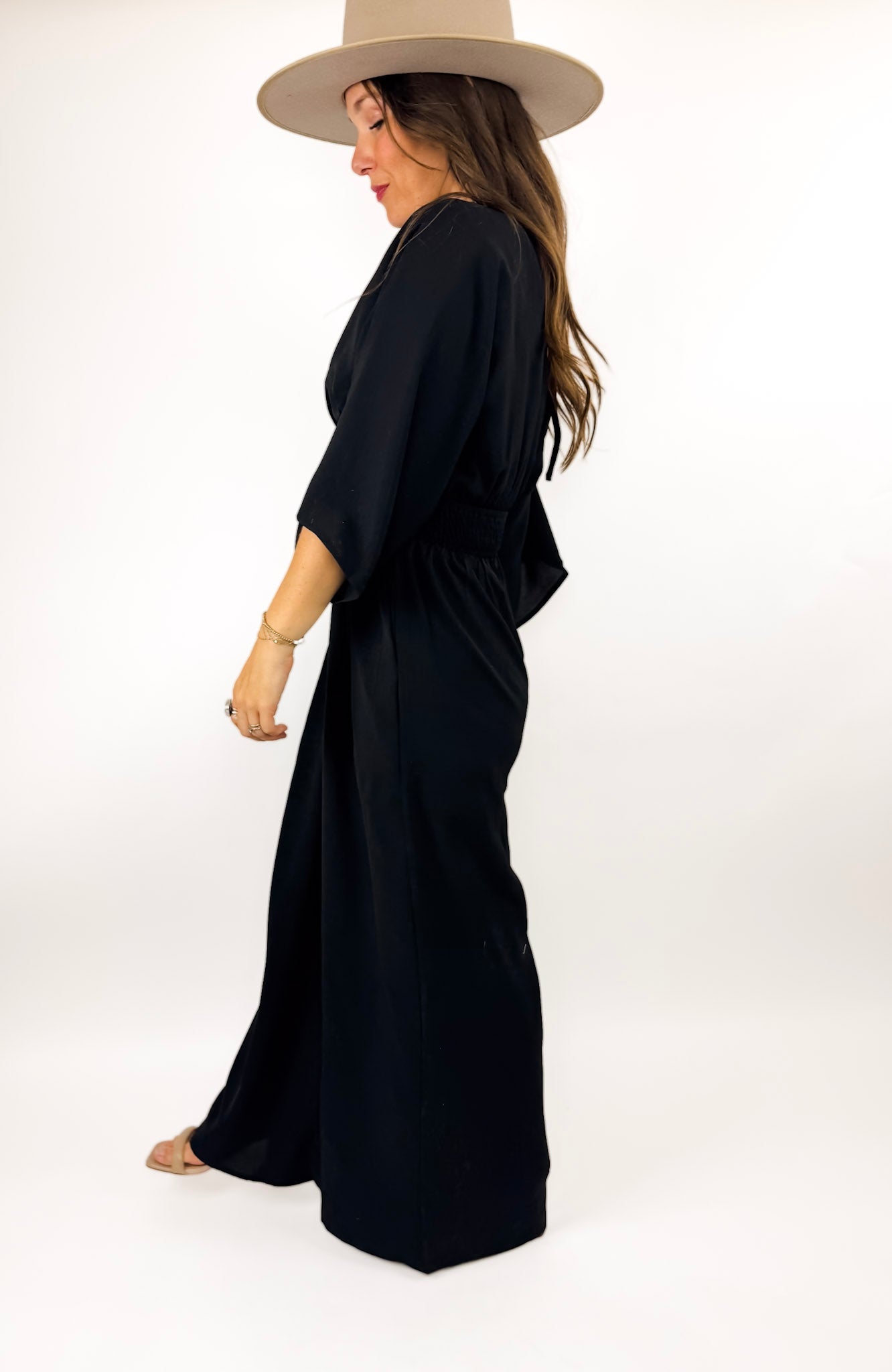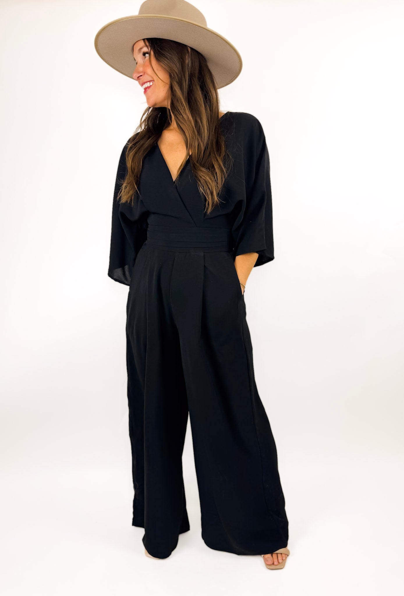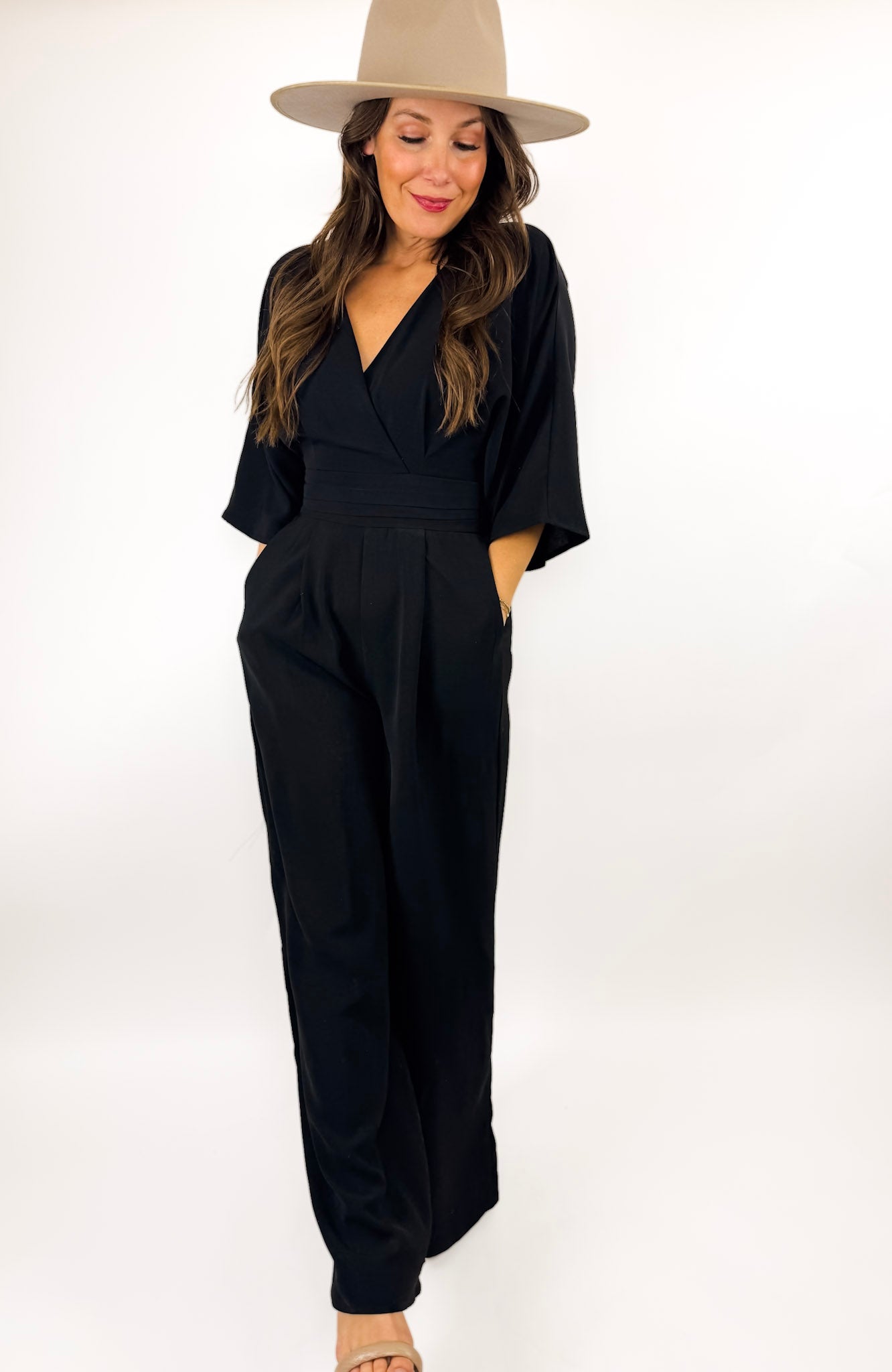 A lovely jumpsuit that is flattering and fun. It's luxe and can be dressed up or down so easily. Available in black, wine, and green.