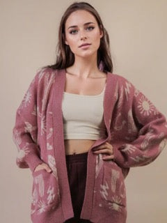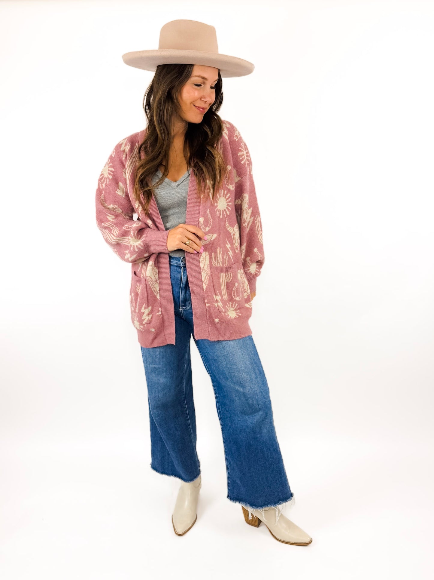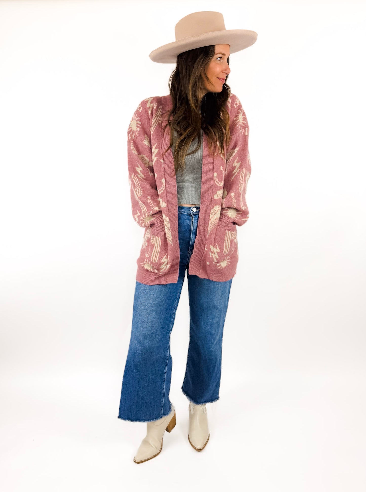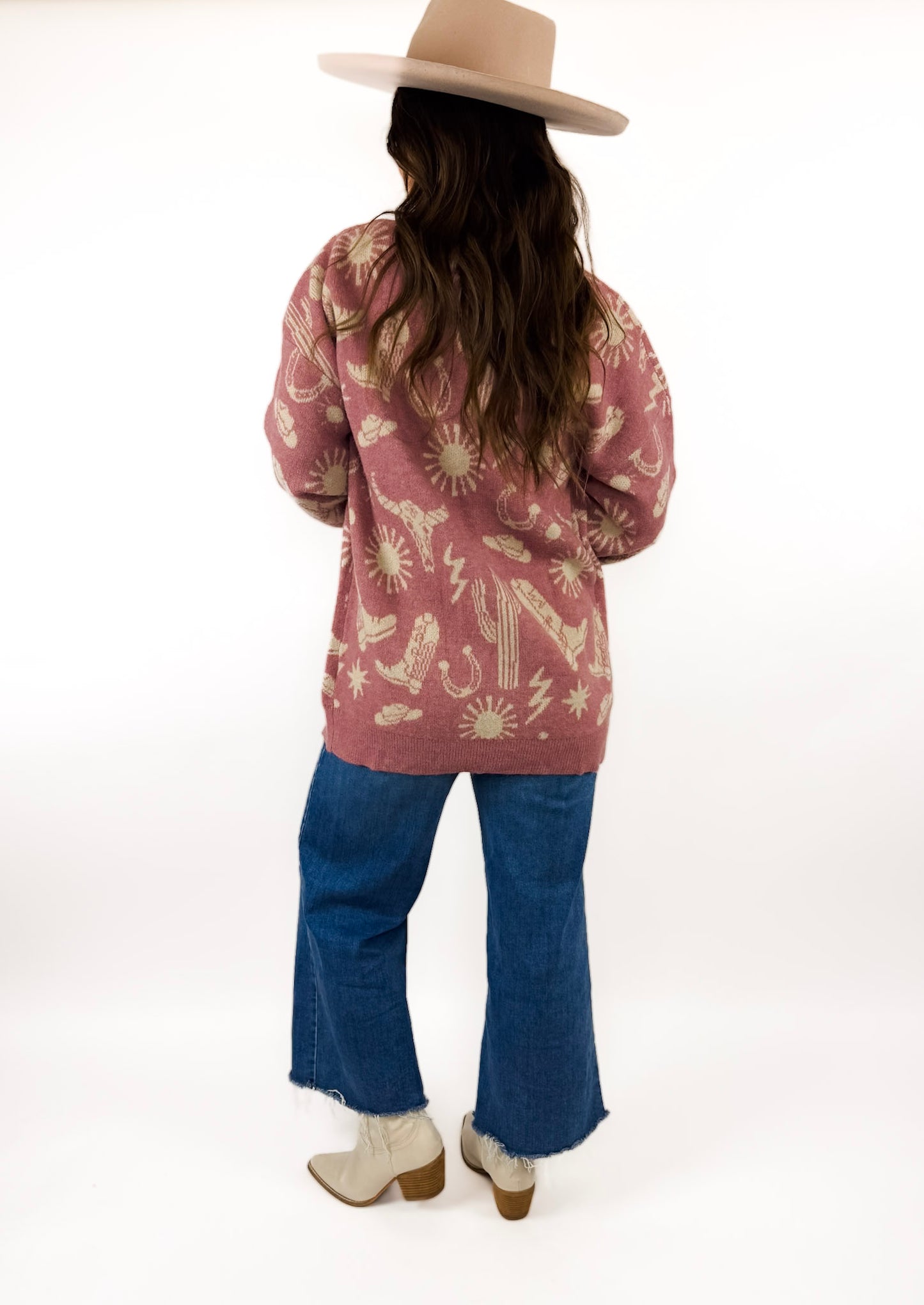 The actual cutest cardigan we've ever seen. It's super soft and is the most gorgeous mauve-y pink color with western emblems all over.