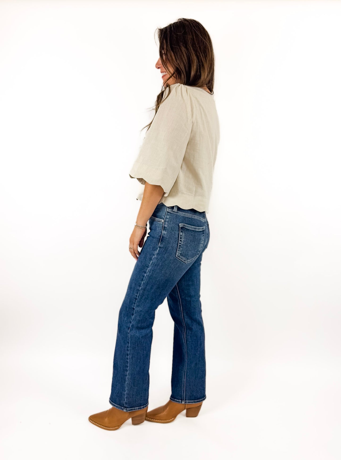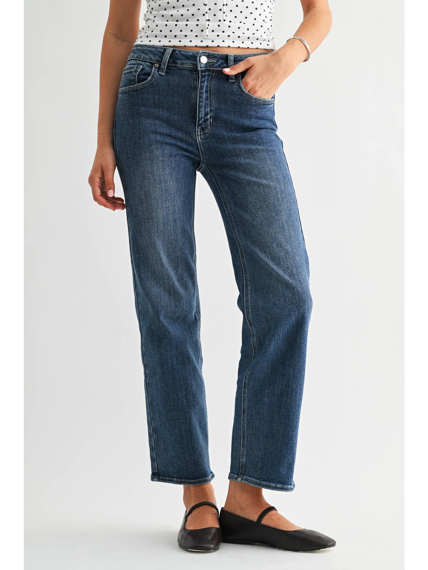 A 90's vibe with more comfort involved from our favorite denim line. These straight, but not skinny jeans are on trend and classic at the same time. A medium/dark vintage wash with just enough stretch, while still having recovery and structure. Super cute cuffed, as well.