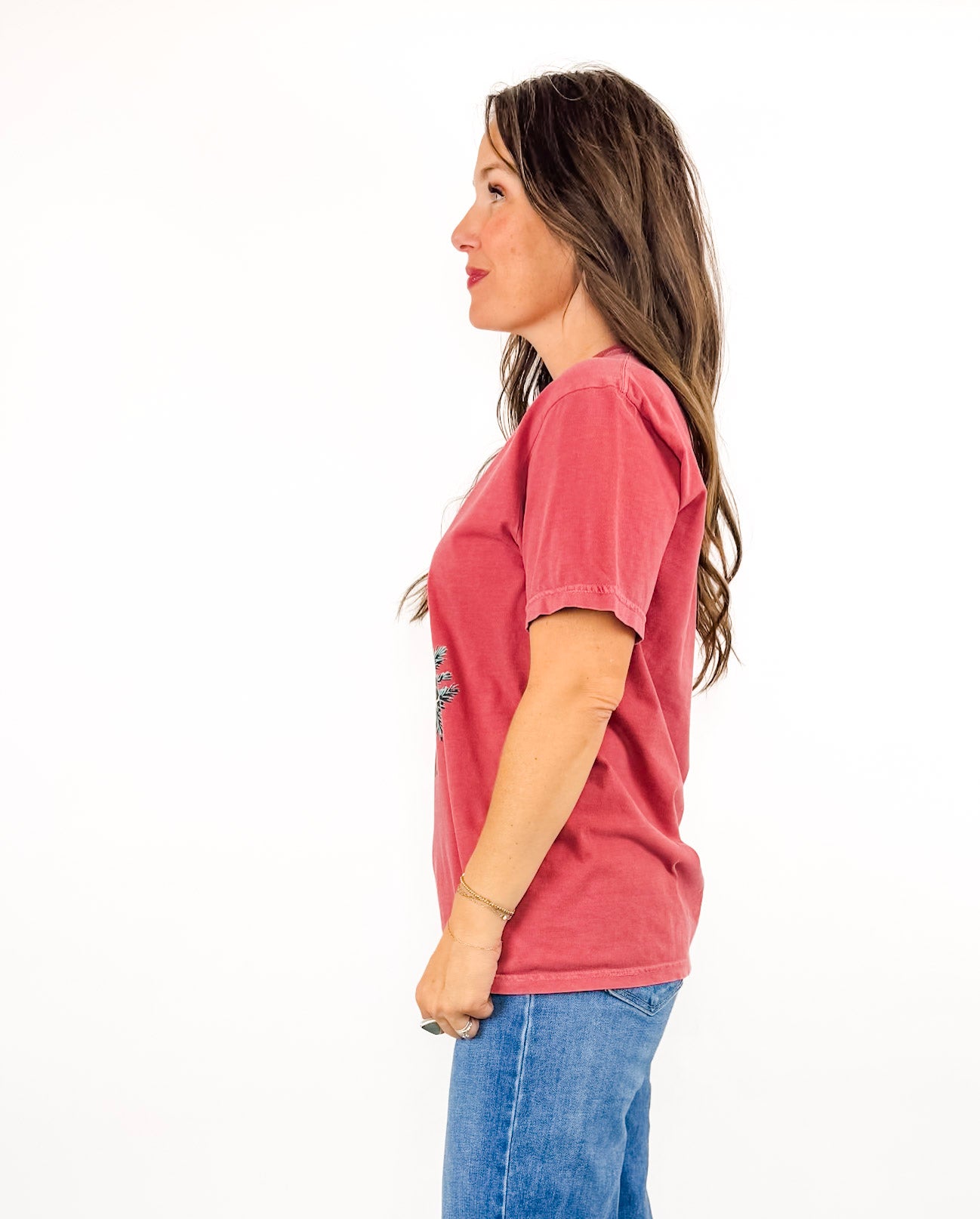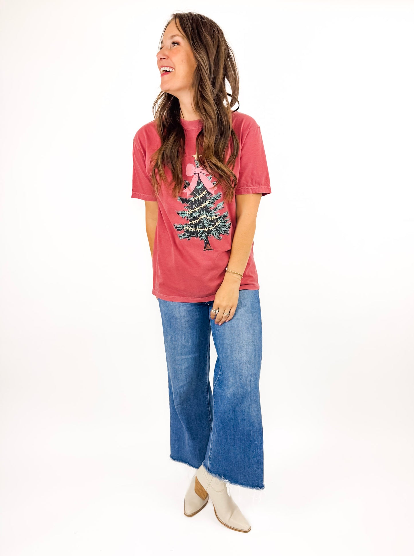 A cute little graphic tee that has the sweetest retro christmas tree adorned with a bow. Styled here with the frenchie jean and dolly boot.