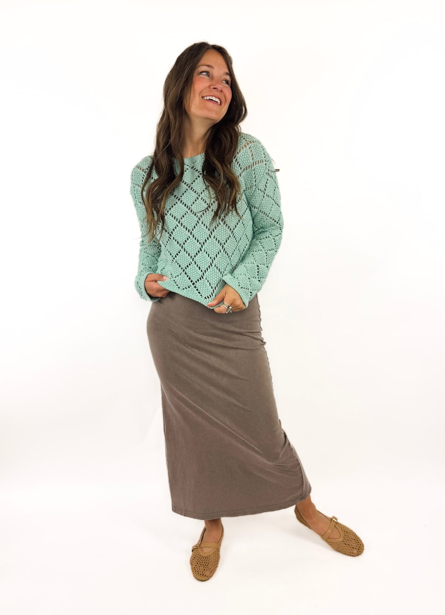 Sleek and simple, this body-skimming midi skirt is fitted at the waist with a flat elastic waistband for all-day comfort. Crafted from soft cotton jersey fabric, it’s the perfect versatile piece for any wardrobe. Wear it with the matching sloan tank for an effortless set. Also available in black and jersey denim.